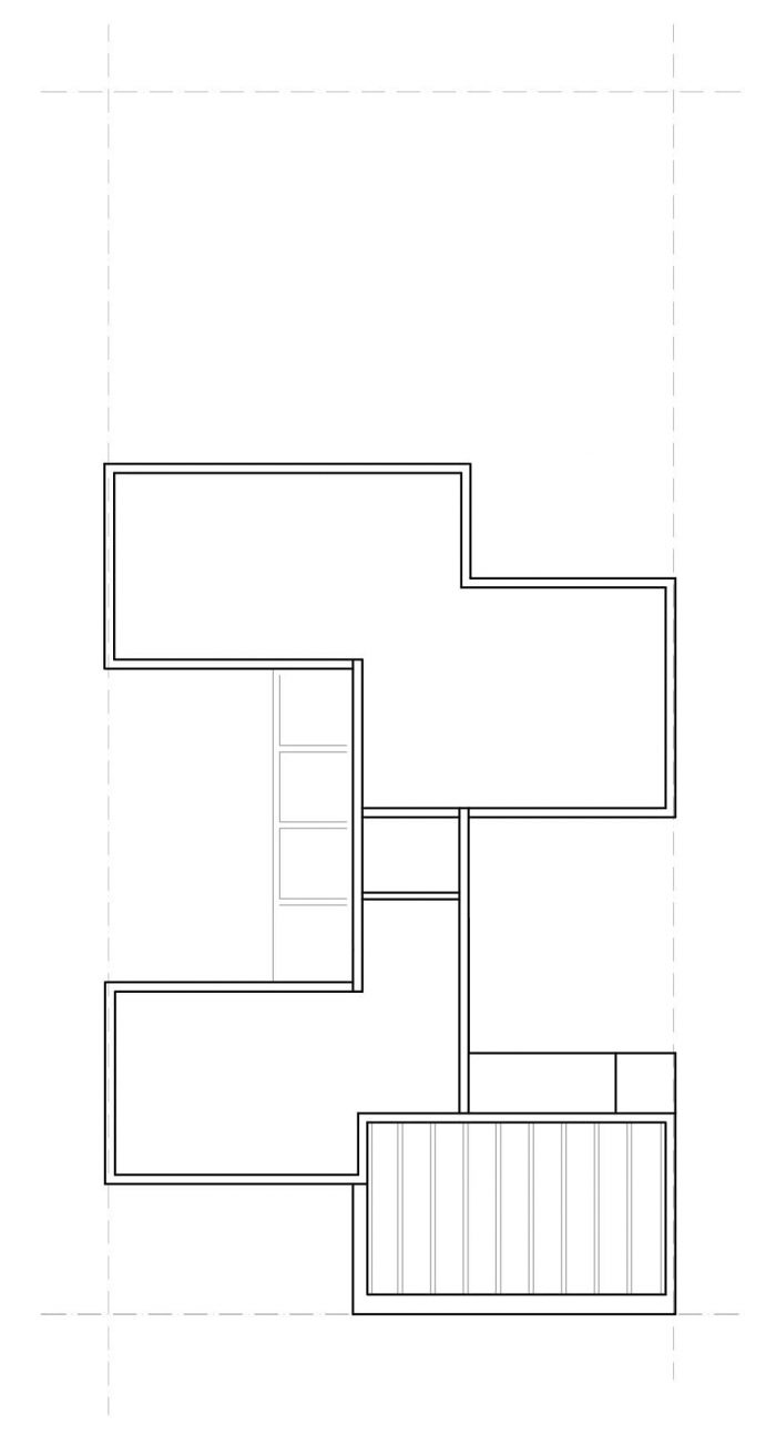 一二层的单元是单间公寓,有可能被分割或作为一个单一的空间工作,因为它们可以作为办公室使用。在二楼,布置了两个复式单位,它们在顶层向后退去,产生了露台。