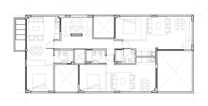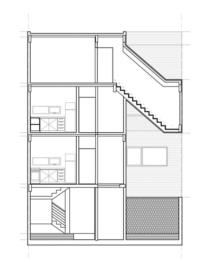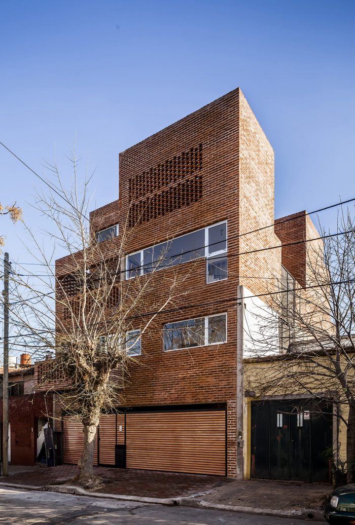 The building incorporates the scale of the neighborhood on the front and back facades, joining the courtyards with the neighboring boundaries, and producing a setback on the top floors. Construction is designed with one floor less than allowed by the zoning code. The project takes the pattern of the architecture of courtyards, characteristic in many of the traditional neighborhoods of Buenos Aires.