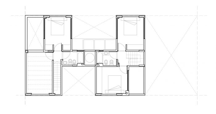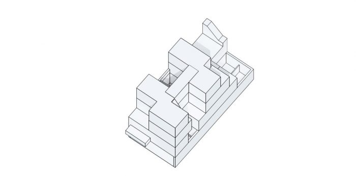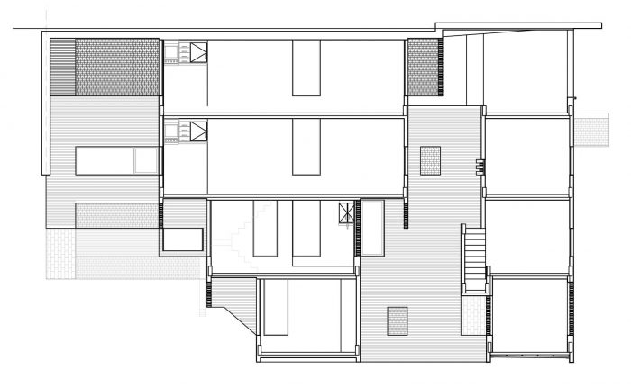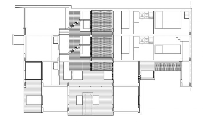 The program is organized into four stories, with a system of courtyards and a central service block, with the private and semi-public spaces laid out around it. This articulation of the building volume with the succession of courtyards allows for the creation of spaces with cross ventilation, which capture natural light at different times of day.