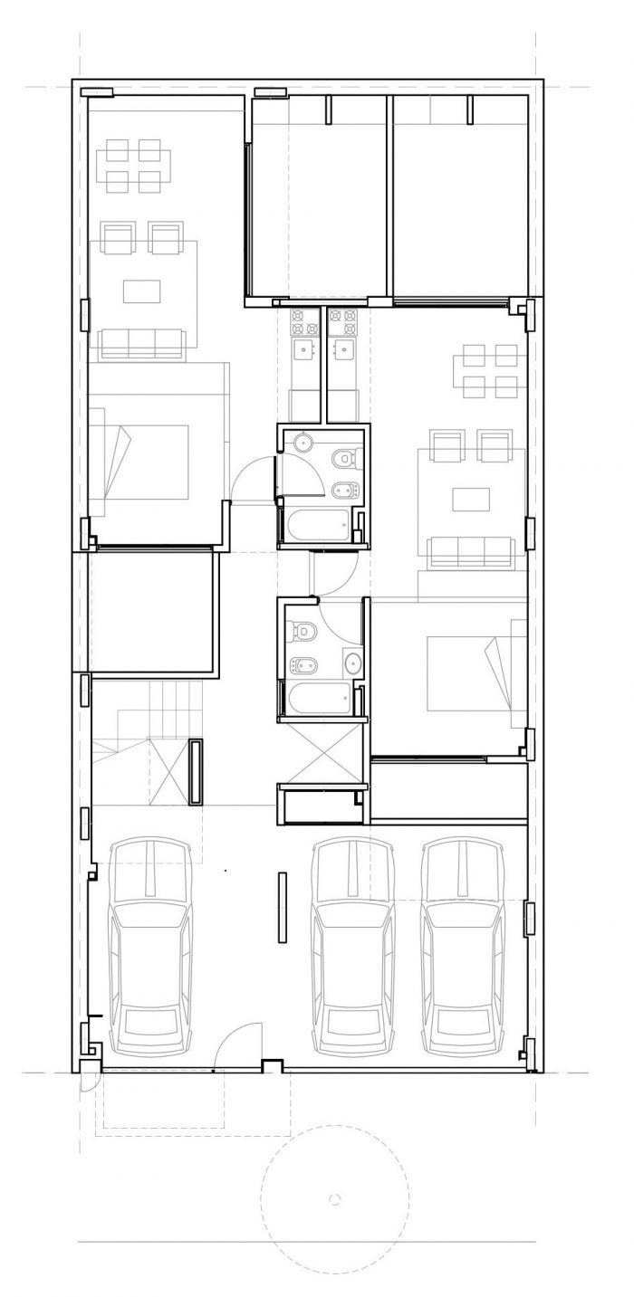 OZ 3459 is a condo building with seven housing units located in the Saavedra neighborhood, a residential area in the city of Buenos Aires. Located in an unusual city block on an alley, with height limitations set by the r2bi zoning code, this small area of 8.66 m x 18.00 m gives us the possibility of placing a building on the entire land area.
