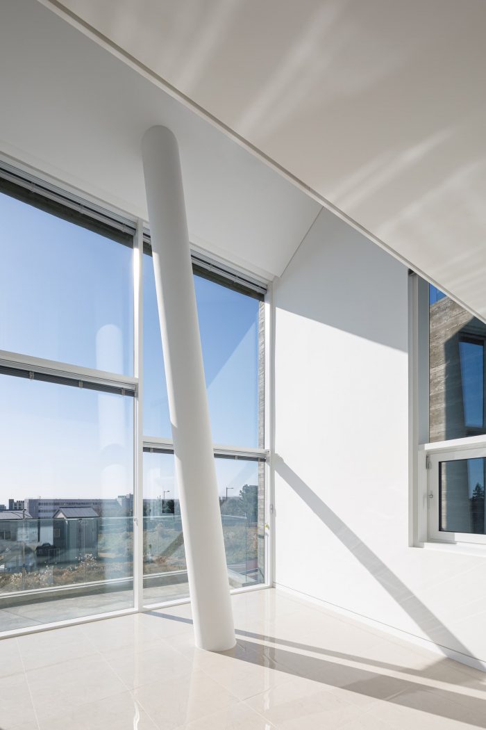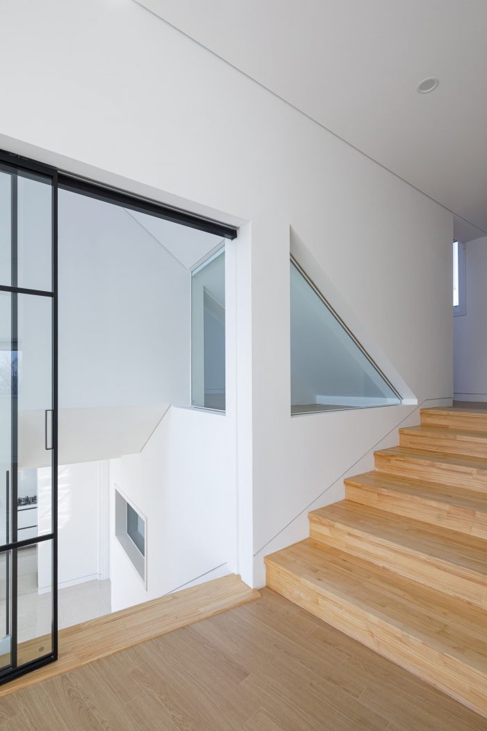 升起的8个房间。倾斜的场地给了正面朝南的一个非常清晰的视野。所有的8个房间都可以看到风景和充足的阳光。房子的入口在北面,有一个小的玄武岩竖起的围墙,带来了入口处的感觉,并对臭名昭著的济州风有一定的保护作用。门厅并没有给人任何通往主要空间的视觉钥匙,除非你转个弯,上几个台阶。生活空间是一个双层高度的空间,有一个倾斜的柱子支撑着4楼的图书馆。再往上走几步就到了厨房/餐厅,当你通过更多的台阶时,你会被引向未来的一个孩子的房间。这种通过台阶和坡道的上升运动一直持续到顶部,那里有图书馆,可以看到太平洋的美景。南北轴线的图书馆有阶梯式的座位,到了北面,然后提供了一个通往阳台的门,在那里可以看到哈拉山的景色。坚实的叠浪姿态已经敲定。
