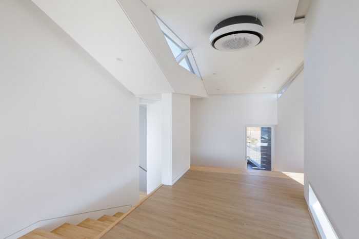 The ascending 8 rooms: The angled site gave a very clear view to the front-facing south. All 8 rooms could have views and ample sunlight. The house entrance is at the northern side with a small basalt rock erected fence wall bringing a sense of entry place-ness and some protection from the notorious Jeju wind. The foyer does not give any visual key to the main space unless you make a turn and ascend a few steps. The living space is a double-height space with an angled column supporting the library on the 4th floor. A few more steps up take you to the kitchen/dining area and when you move through more steps, you are led to one of the future kid’s rooms. This ascending movement through steps and ramps continues all the way to the top, where there is the library with a great view of the Pacific Ocean. The south-north axis library has step seats to the northern side which then provides a door to the balcony, where Halla mountain view is possible. The solidly stacked wave gesture is finalized.