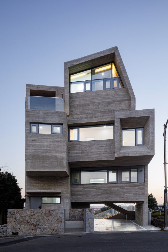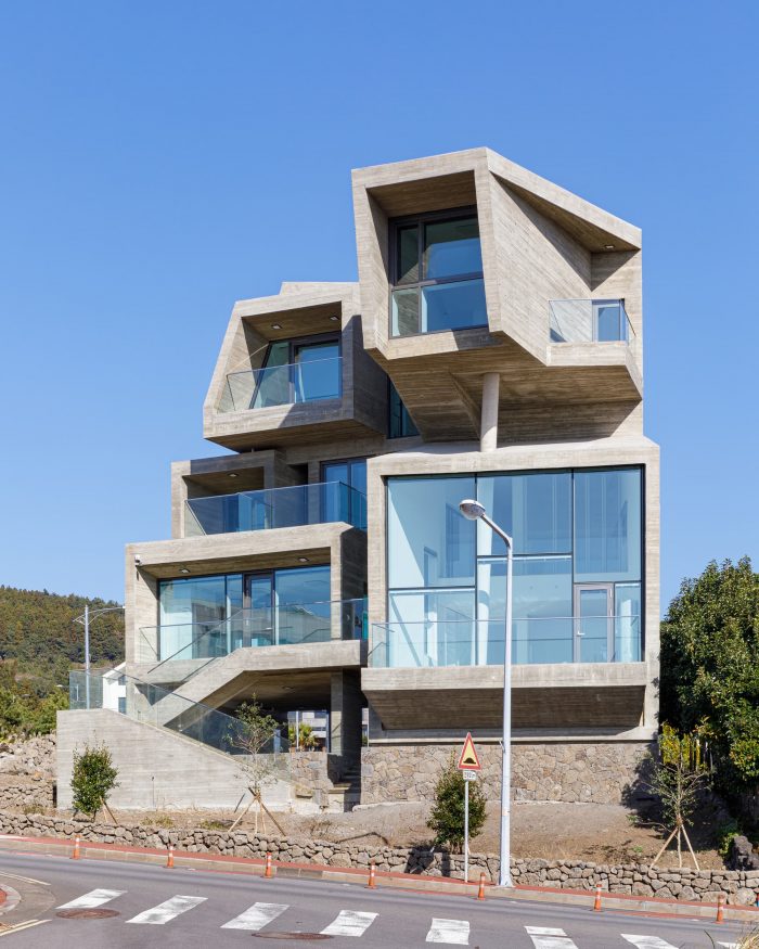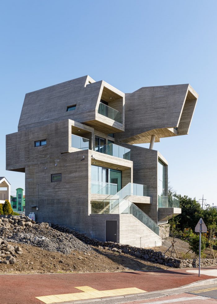 Final word: The wood plank imprinted exposed concrete has been a staple material for many of my projects in Jeju Island because it seems to go well with harsh windy weather and abundant basalt rocks. It is as though the new building has been standing there for a long time.