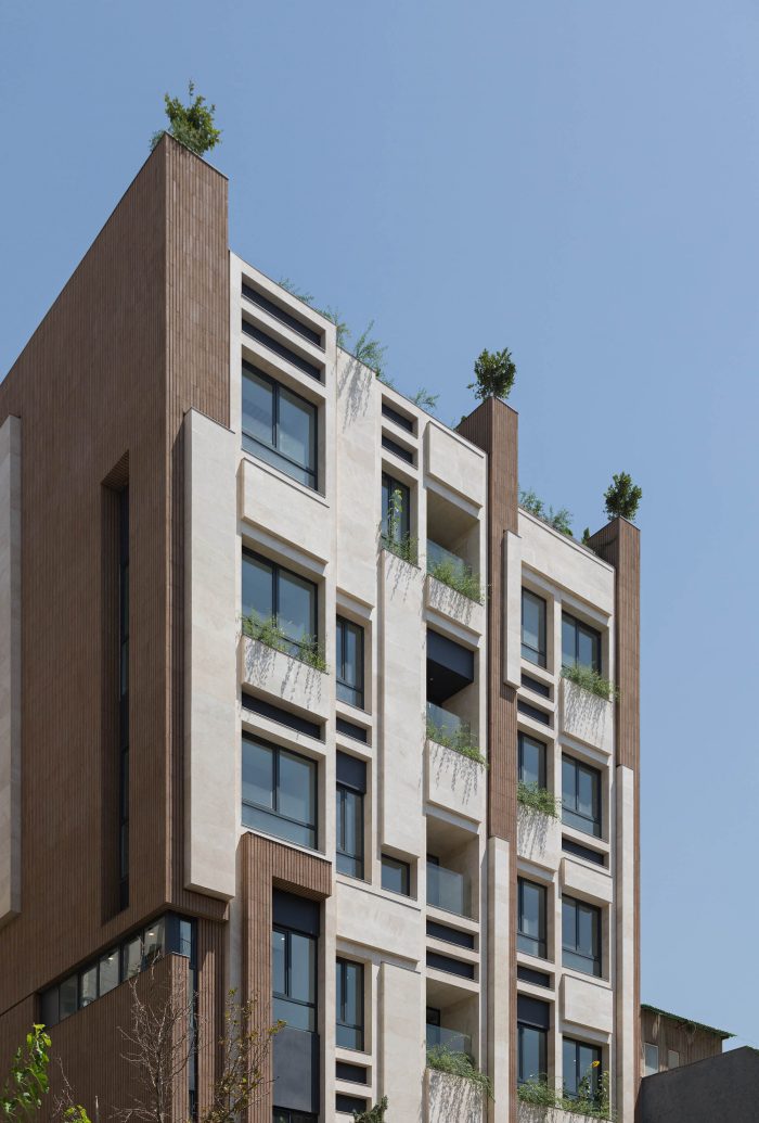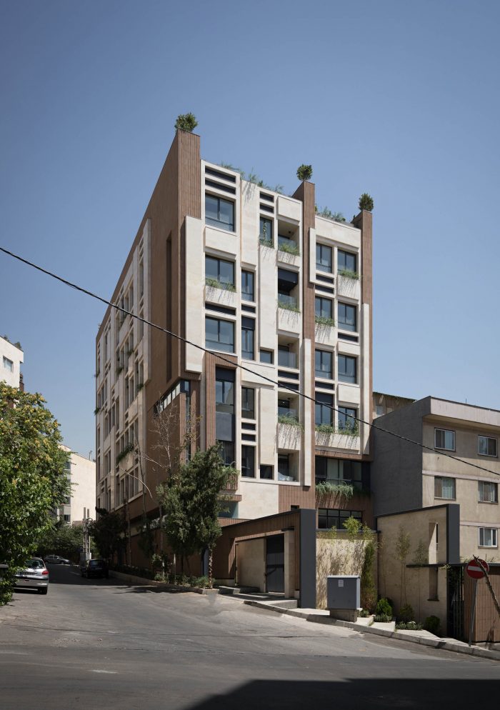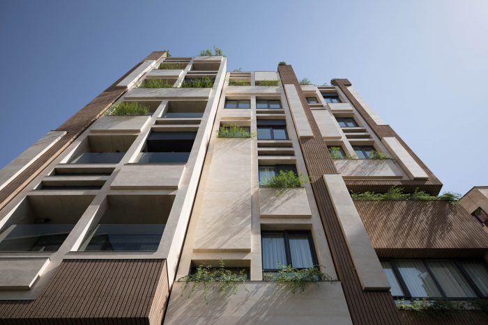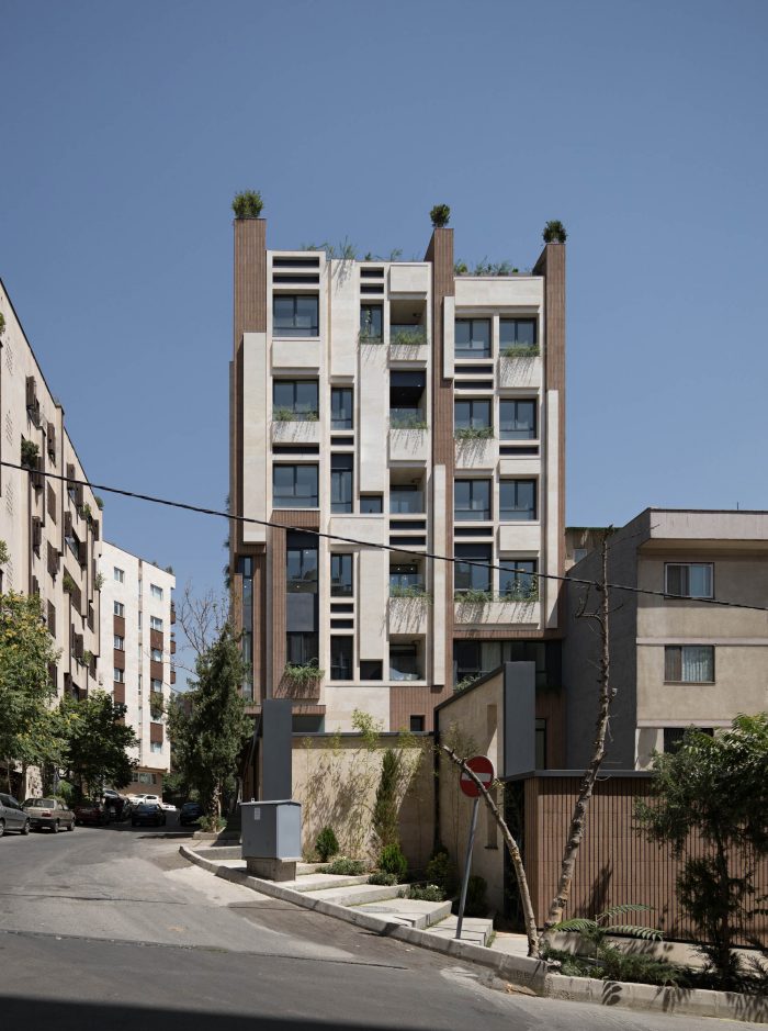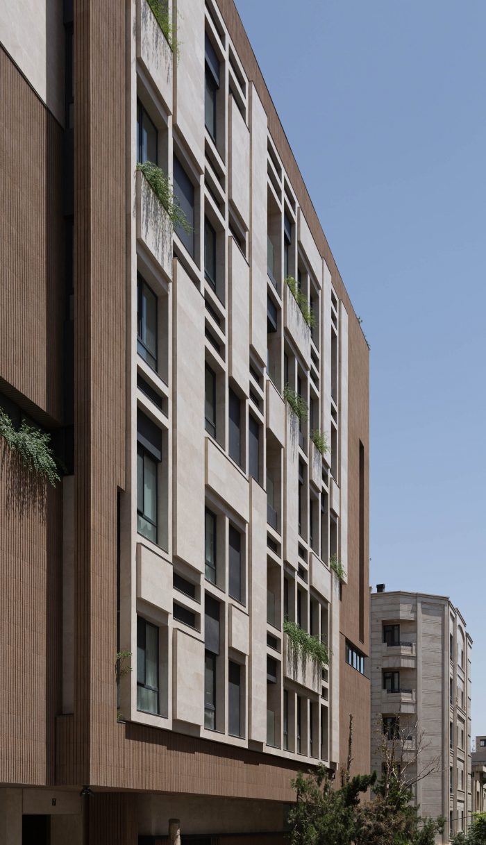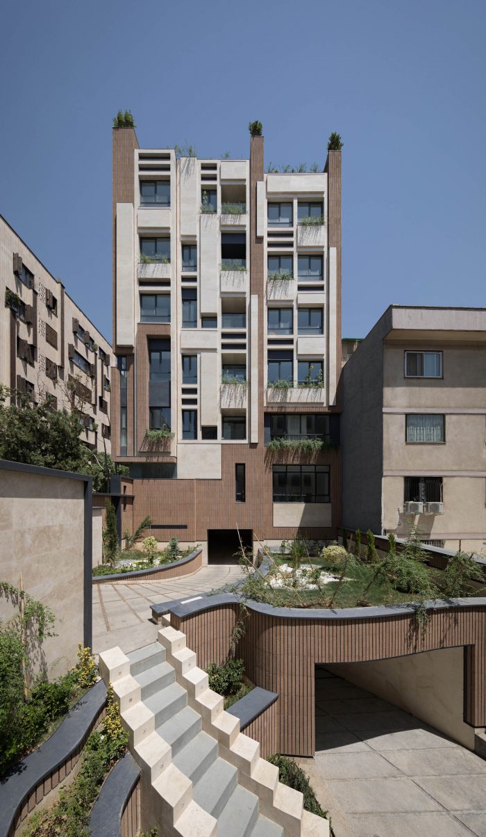 The PAEIZ 6 project is located in Tehran, at the intersection of 3 streets. There is a small green space in the northern part of the project. For this reason, the entrance of the complex was defined in this section to ensure easier access, and to be able to enjoy the desired view of the greenery from the lobby. The facade shell with its positive and negative horizontal levels is inspired by NAHAZ O NAKHIR (a kind of bricklaying method in Iranian historical architecture) so that the viewer can see different lights and shadows at each hour of the day. Among these shapes, Using plants also helps to avoid routine.