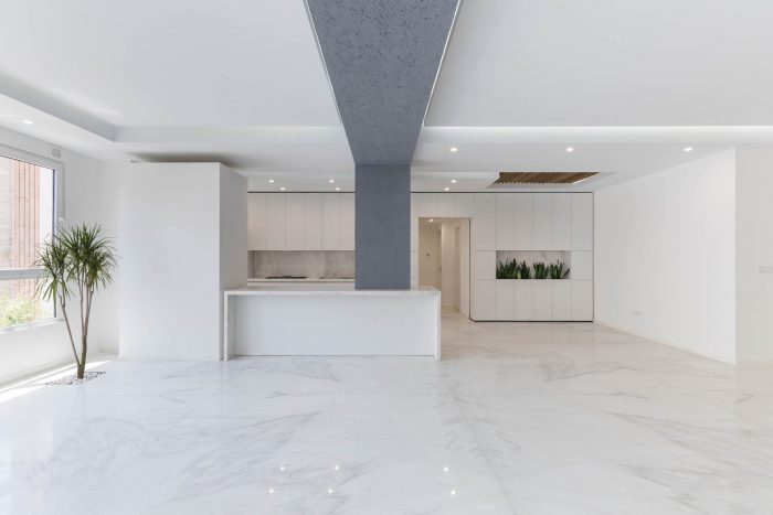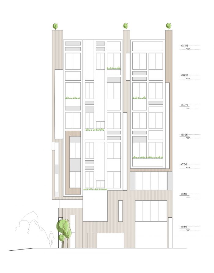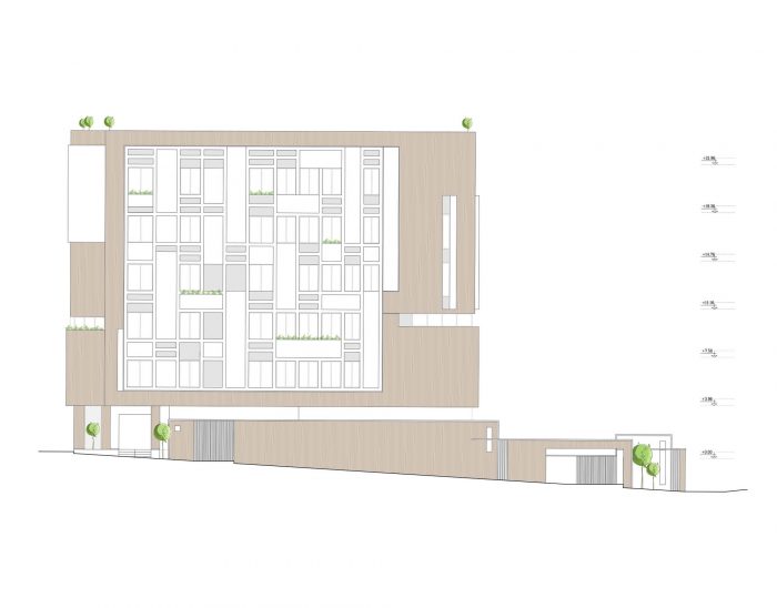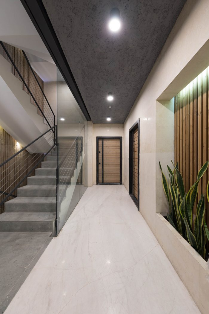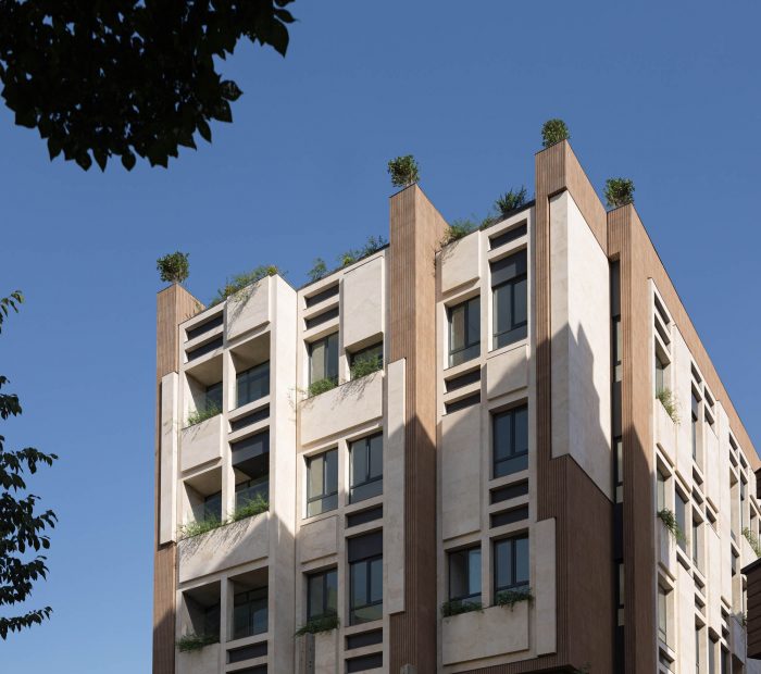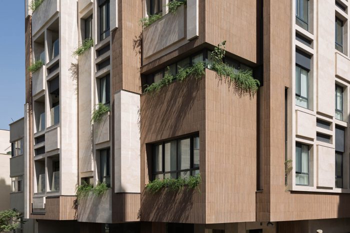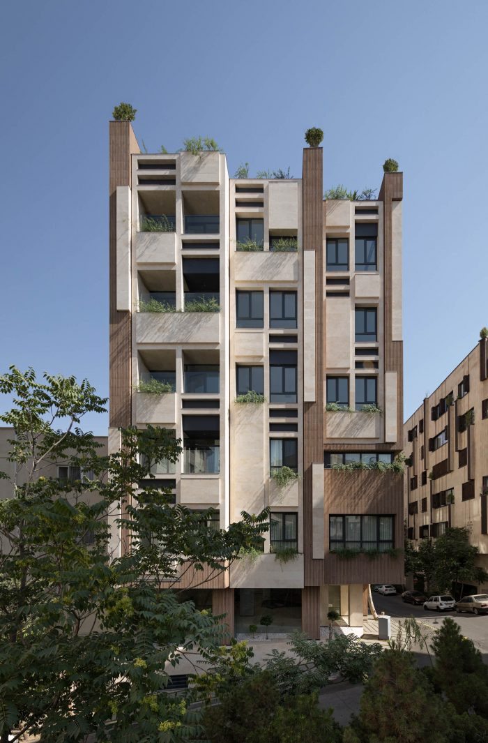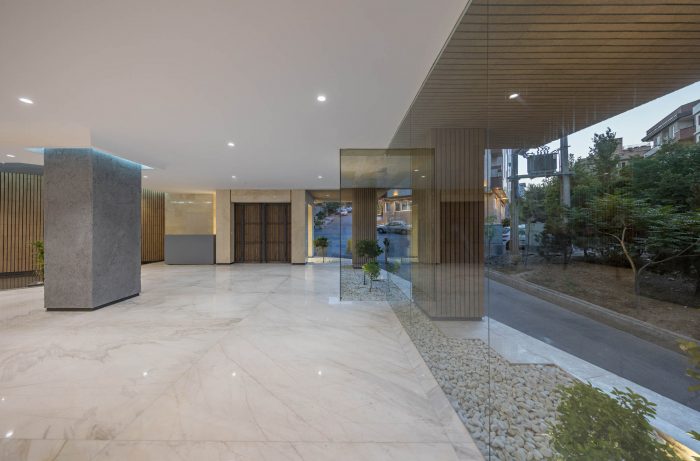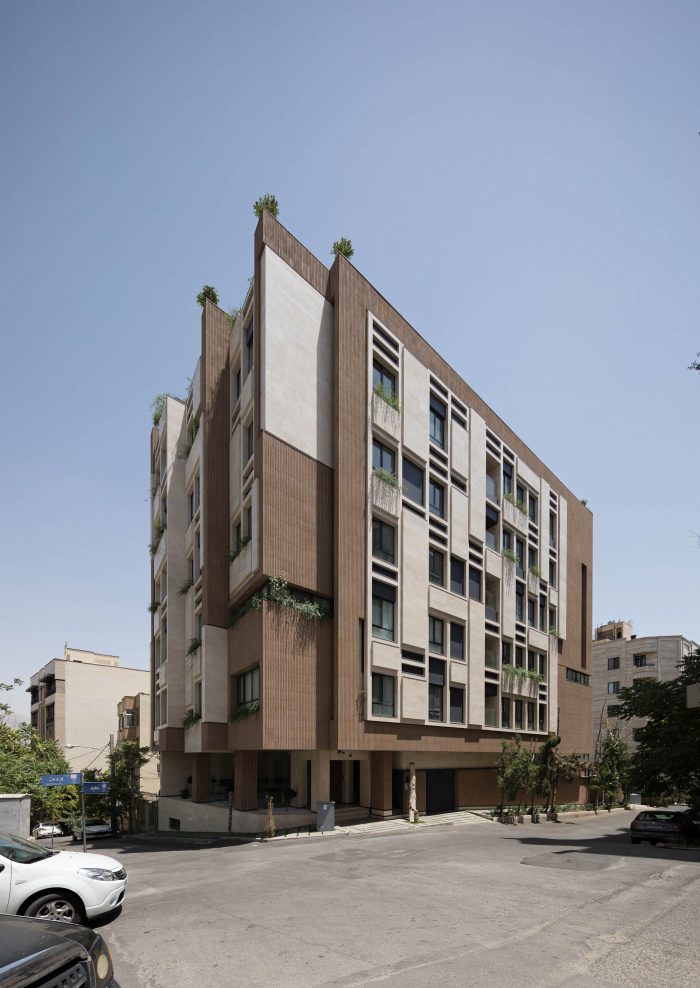 The PAEIZ 6 project is located in Tehran, at the intersection of 3 streets. There is a small green space in the northern part of the project. For this reason, the entrance of the complex was defined in this section to ensure easier access, and to be able to enjoy the desired view of the greenery from the lobby. The facade shell with its positive and negative horizontal levels is inspired by NAHAZ O NAKHIR (a kind of bricklaying method in Iranian historical architecture) so that the viewer can see different lights and shadows at each hour of the day. Among these shapes, Using plants also helps to avoid routine.