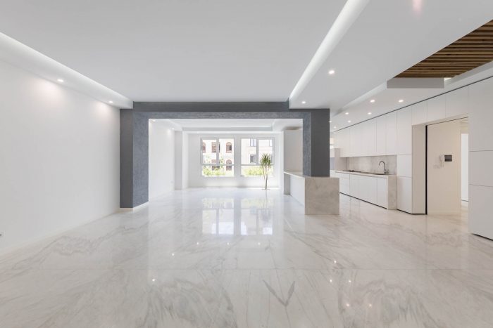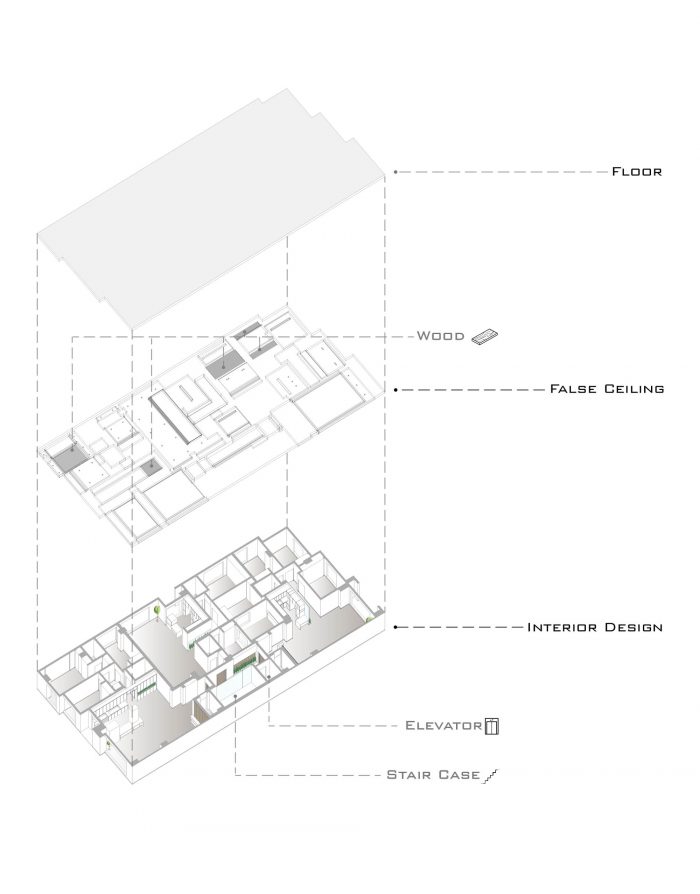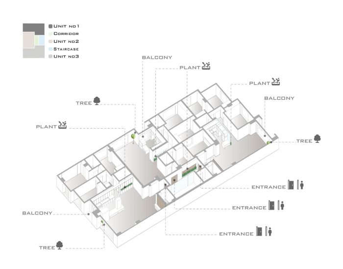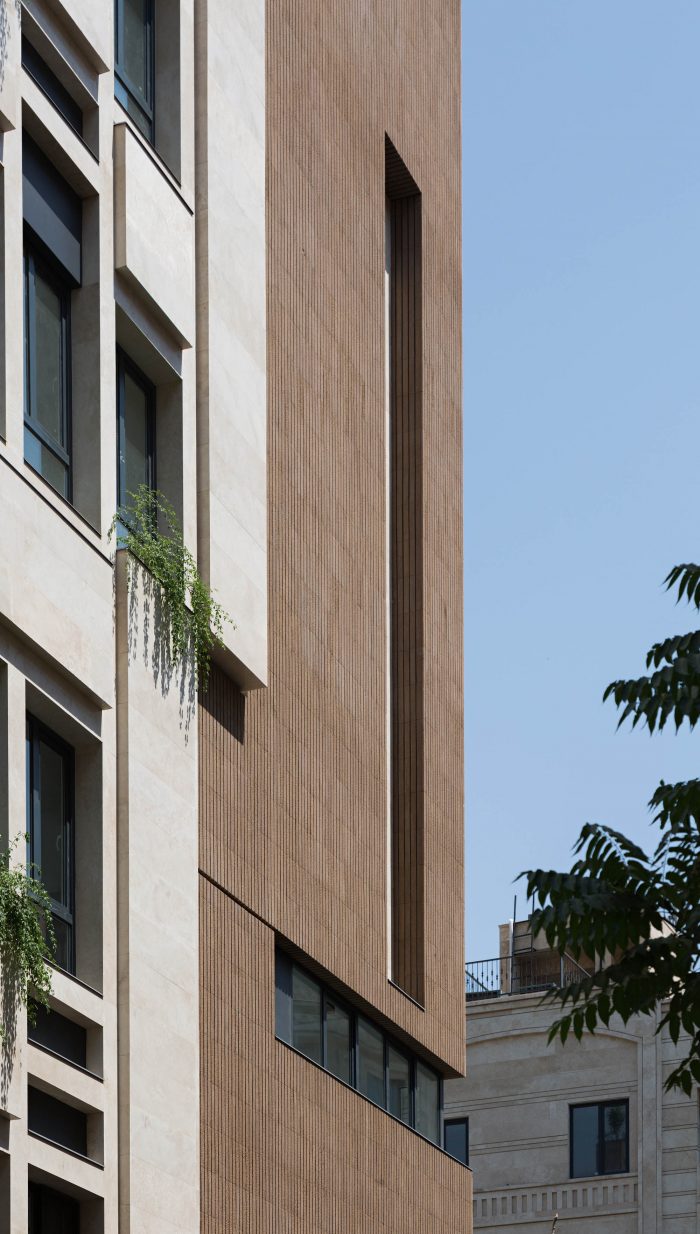 Choosing the combination of brick and stone, while having harmony with each other, has been done in order to respect the city and in order to accompany the surrounding buildings as much as possible. By designing windows like puzzles with different and various dimensions, in addition to being different from the common forms, has formed an integrated shape. Vertical access is placed in the middle of the eastern side so that the units can use as much natural light as possible so that the division and common spaces are reduced to a minimum. Stairs, elevators and corridors which are dividing the units with their transparent material led to maintaining the visual connection of the spaces and as a result, it appears larger.