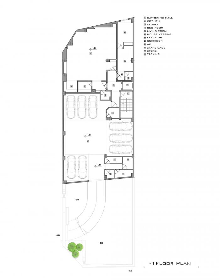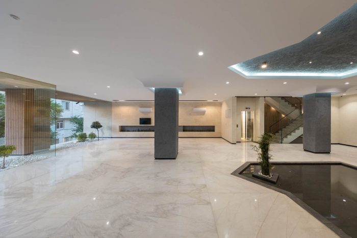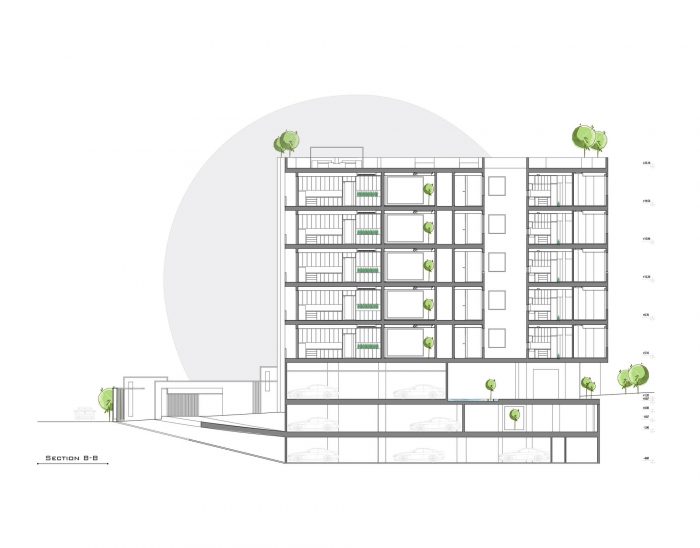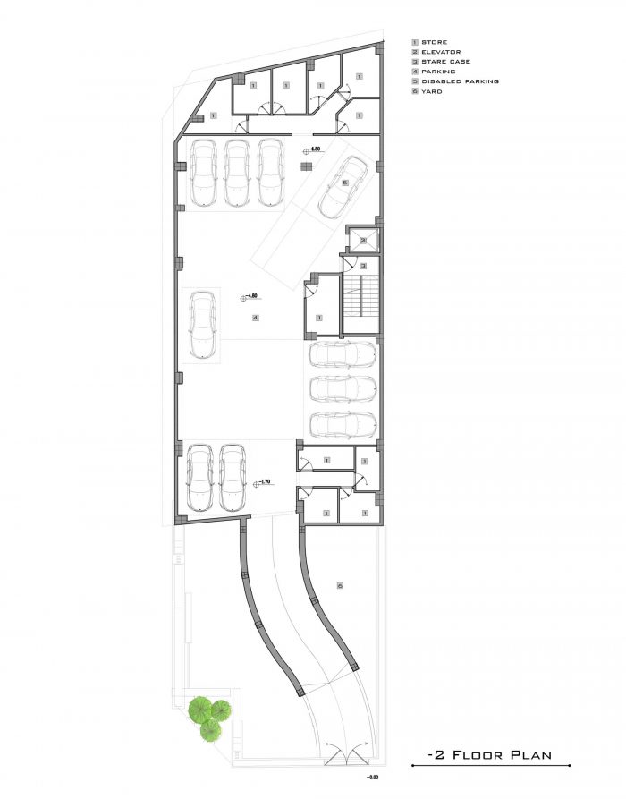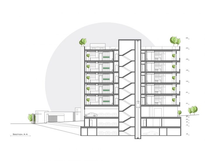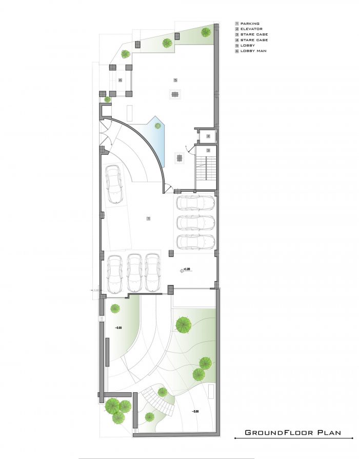 As our design mainstream, the use of plants in the facade, lobby, basements, the lobby between units and interior design can be seen. The yard did not have enough space for landscaping as a result of having two ramps. In order to solve this challenge, The roof of the ramp is prepared to grow plants. The ground floor consists of two parts, the southern part is parking and the northern part is lobby. The lobby, while having seating and waiting areas, includes a guard post and security equipment, which is decorated with Fountain and plants. -1 and -2 levels consist of parking and storage, a gathering hall and a caretaker.