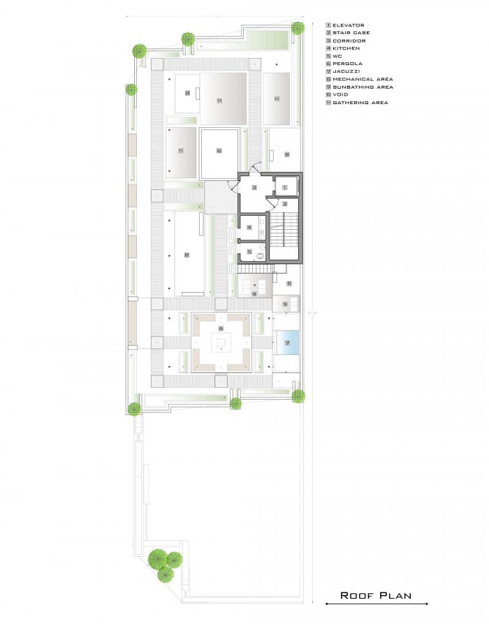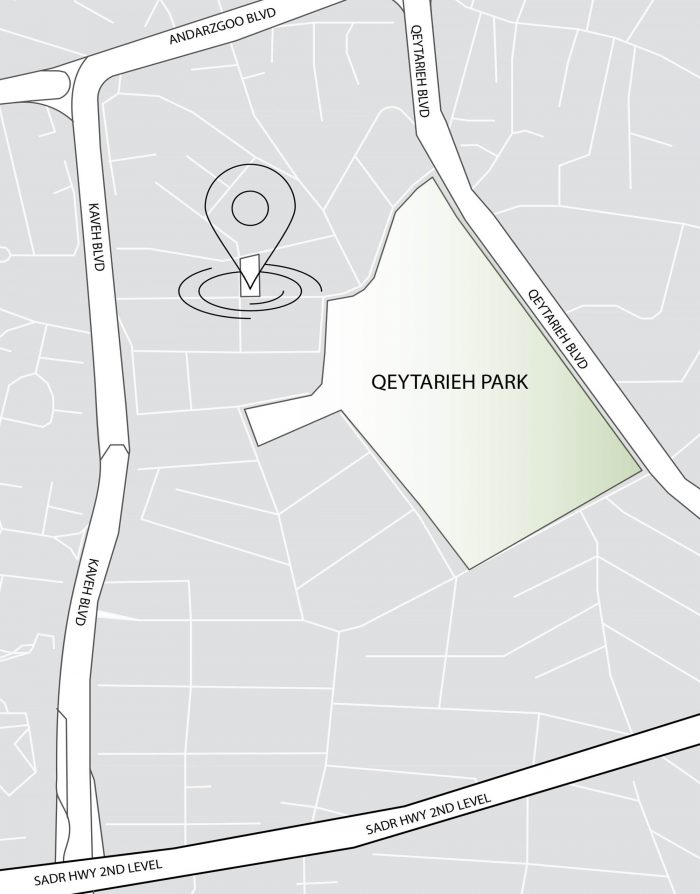 The residential project with 5 floors, totally includes 15 three-bedroom residential units. The roof has various facilities such as a bathroom, kitchen, barbeque, Jacuzzi, sunbathing area and seating and walking areas. Numerous seating spaces are located at scattered points due to the number of units and the possibility of simultaneous use. Walking paths through the gardens have defined a suitable space for walking. Due to the desired view to the north (mountains in the north of Tehran) and south (QEITARIEH Park), the walls of these two sides have been shortened with gaps, while the western wall overlooking the neighborhood is surrounded by higher walls.