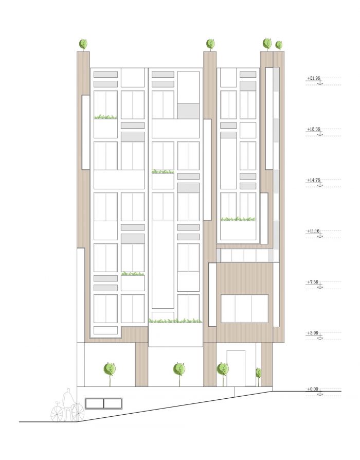 选择砖和石头的组合,同时又有相互之间的和谐,这样做是为了尊重城市,为了尽可能地伴随周围的建筑。通过设计像拼图一样的窗户,有不同的各种尺寸,除了与常见的形式不同外,还形成了一个综合的形状。垂直通道被放置在东侧的中间位置,以便各单元能够尽可能多地利用自然光,从而使分割和公共空间被减少到最低限度。楼梯、电梯和走廊以其透明的材料划分单元,从而保持了空间的视觉联系,因此,它显得更大。