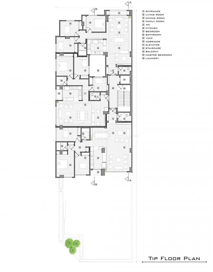 住宅项目有5层,共包括15个三居室的住宅单元。屋顶有各种设施,如浴室、厨房、烧烤炉、按摩浴缸、日光浴区、座位和步行区。由于单位的数量和同时使用的可能性,众多的座位空间分布在分散的地方。穿过花园的步行路径已经确定了一个合适的步行空间。由于希望向北(德黑兰北部的山脉)和向南(QEITARIEH公园)眺望,这两边的墙被缩短了空隙,而俯瞰街区的西墙则被更高的墙包围。