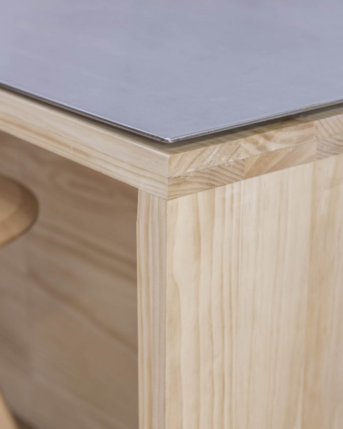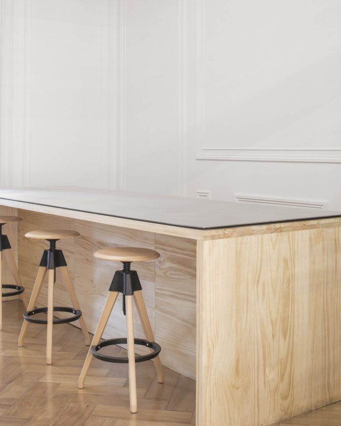 Working within a tight building budget, it was established early on with the client that we were looking for a low cost but elegant aesthetic, balancing the cheap with more expensive accents, or “like wearing a worn-out T-shirt with some expensive jeans” as Pedro, one of the company’s founders, once told us. The wood provides a good example of this approach, while not the cheapest wood available, it has a nice warm color and is free of knots, giving the furniture a more homogeneous and abstract look, like a solid piece, while on close inspection the on-site fabrication would reveal slight imperfections and a certain rustic quality.