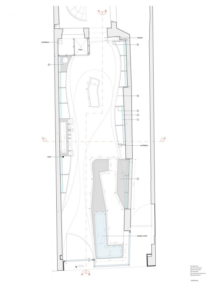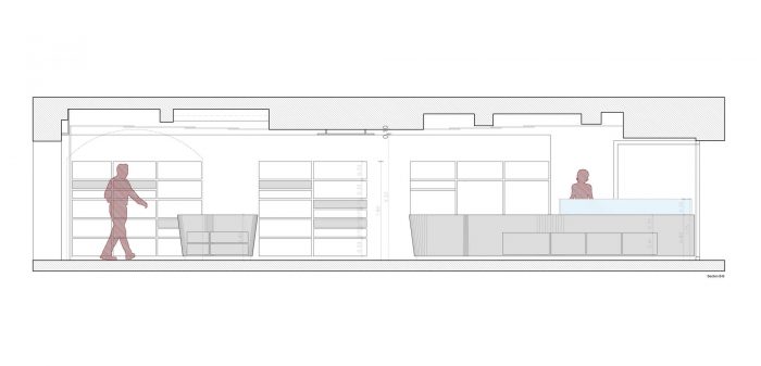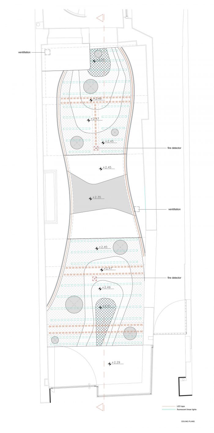 Ceiling and floor design followed the principles of fluidity while the use of different materials allowed the existing floor and ceiling of the shop to be preserved following the wish of the landlord.