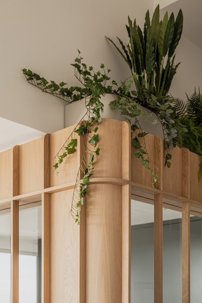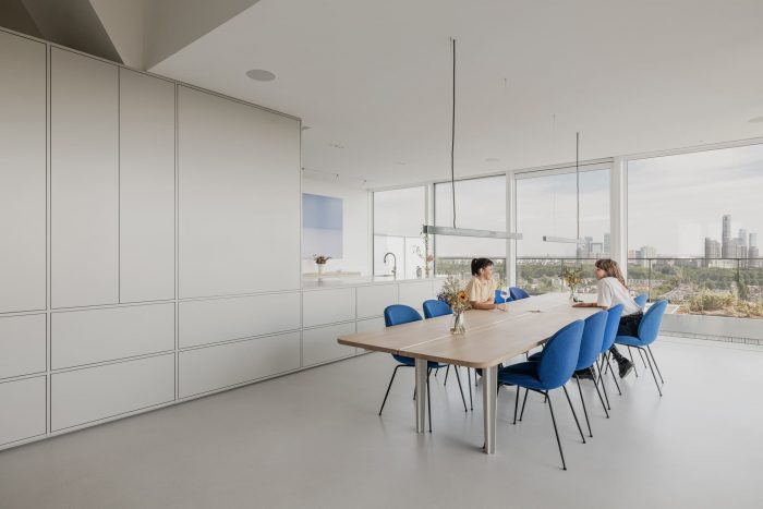独立的木质体量可容纳私人功能,如主浴室、步入式衣柜、桑拿房和办公空间。同时,这些体量将公共区域和走廊与两间卧室大致 "分开"。如果需要,可以通过关闭整齐地集成在木质体量中的全玻璃钢制滑动门来实现物理隔离。在夜间,滚动的百叶窗和非玻璃门可以在视觉上将房间与公寓的其他部分分开。在顶层公寓的短端,公共区域被组织成一个三脚架,包括高架起居室、媒体和休息室、以及用餐区和厨房。
