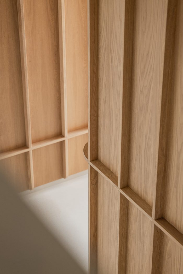 In a well-balanced contrast to these neutral colors, the free-standing volumes on the seaside are related to the colors of the dunes and beaches and therefore materialized in light oak wood. These volumes create a warm and natural touch with their color, texture, and refined details. In contrast, in the kitchen and dining room, the sober grey colors refer to the modern city skyline.