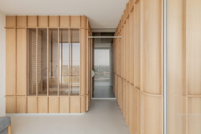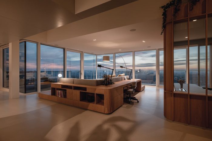 By designing an open floor plan with free-standing oak-wood volumes the façade was kept clear. This way, the surroundings are always present in every part of the penthouse making you fully aware of the changing colors of the seasons, the tides, and of the sunrise and sunset that are never the same. To strengthen this relationship with the surroundings the architects chose a neutral basis of white and light grey colours for the floors, ceilings and existing walls.