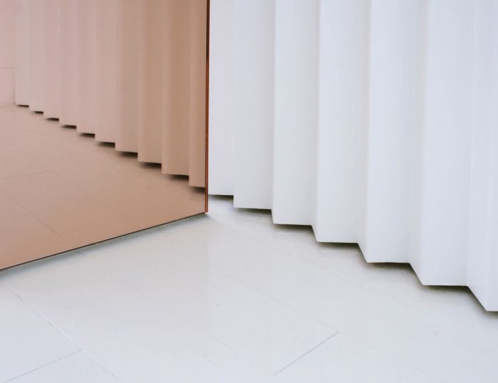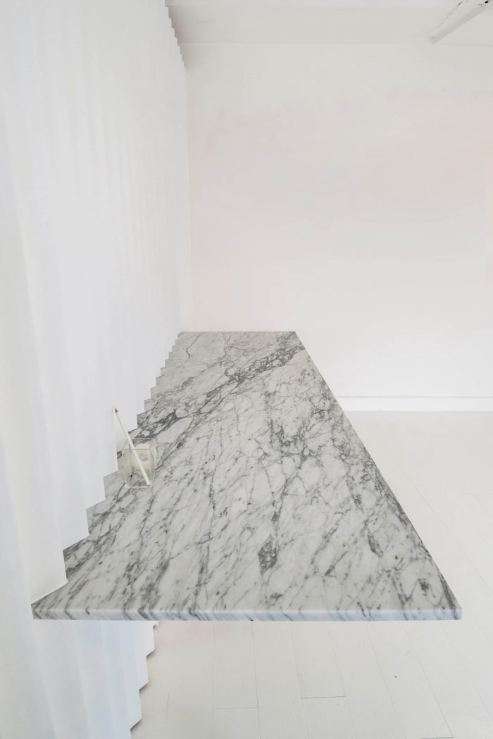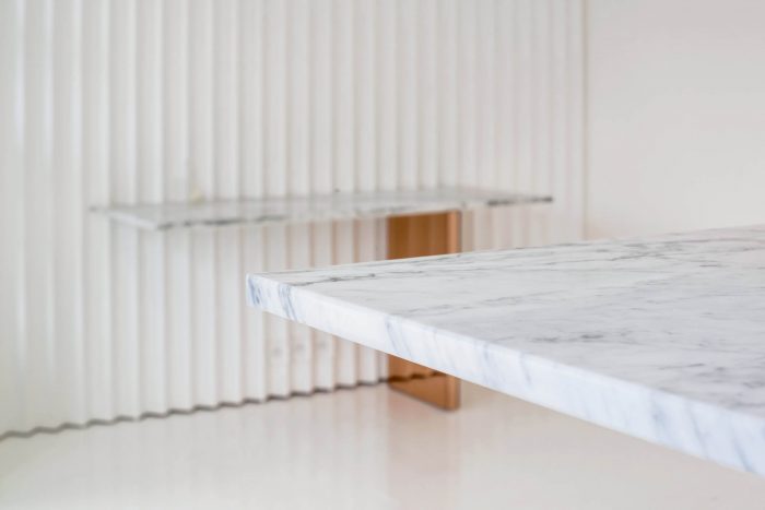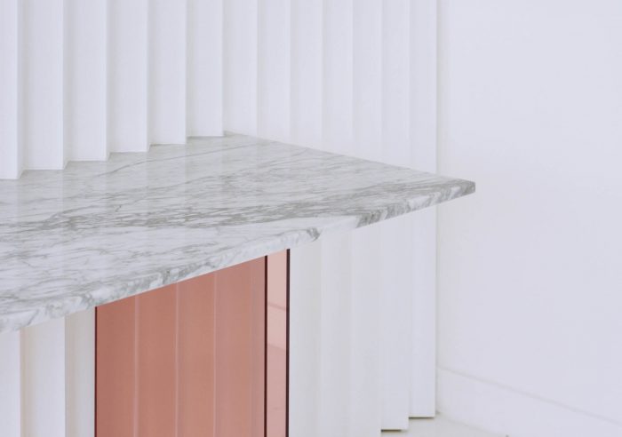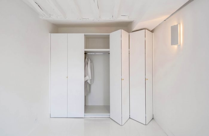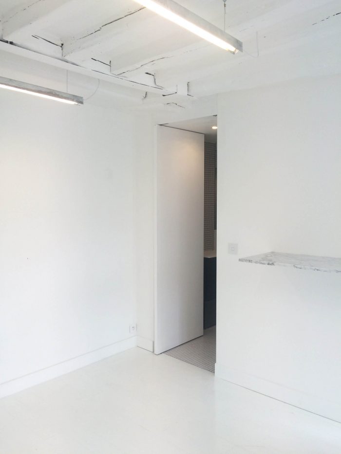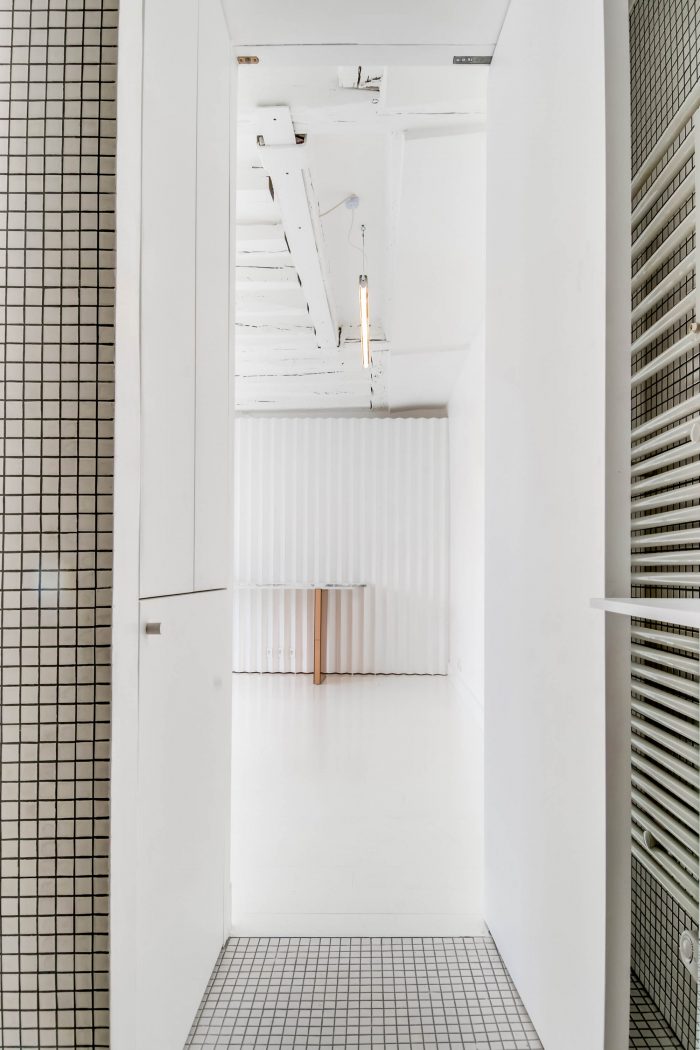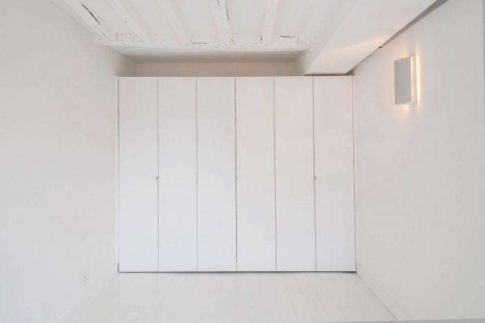 The flat has been entirely painted in white to emphasize the specific texture of each material. This work on texture can be found in the new elements that have been used: accordion, mosaic, marble and lacquers in a cameo of white. This neutrality of tints, barely disturbed by the light coming from the mirrors, will allow a subtle contrast between Old and New.