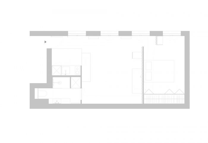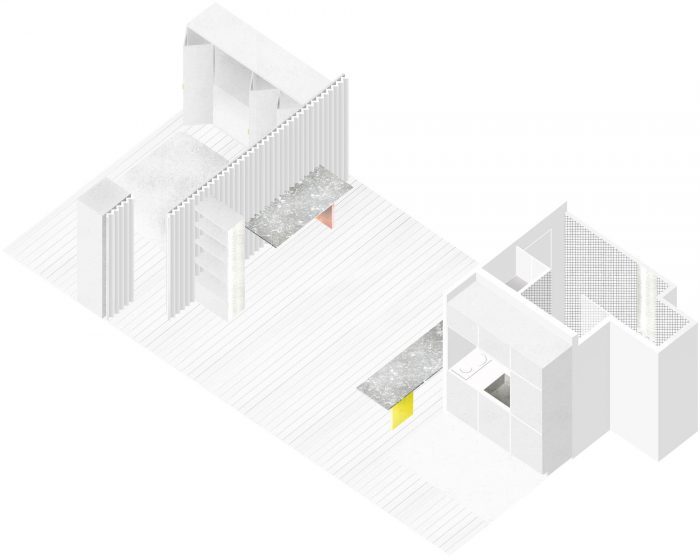 一个紧凑而有效的技术区,包括浴室、厕所和厨房,将位于公寓的一端,以便为卧室和客厅腾出最大的空间。位于另一端的卧室将通过一个振动的风琴式隔断与客厅分开。这个隔断的设计是为了创造一个通往卧室的亲密和隐蔽的通道。技术区和卧室之间的中央空间将专门用于建造客厅和办公室。每件家具都将是定制的,并有一个特定的功能,以这样的方式来创造一个画意的构成。