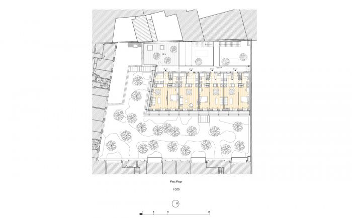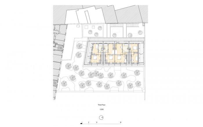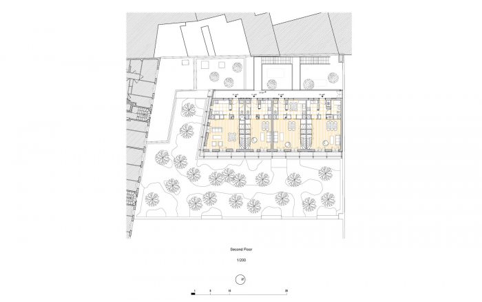 它的结果是重复了在窗户的规模上所做的决定,这些决定的动机是结构上的限制,以及对耐用性的追求,由于突出的阳台和白色的保护漆,保护了木梁的末端,在外墙上创造了一种节奏,使其具有自己的特性。