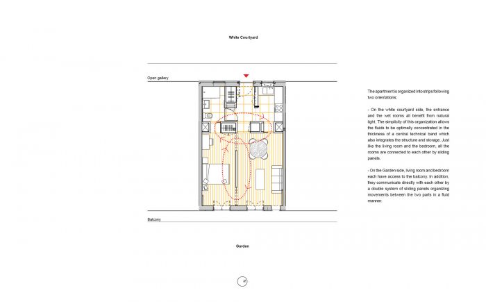 The project has to be exemplary with current concerns: quality housing (light, atmosphere, materials) and frugality in their construction and energy consumption. The open gallery strategy made it possible to design run-through plan configuration for all flats systematically, an intrinsic quality allowing space expansion, clearance of corridors as well as a simple and effective natural ventilation.