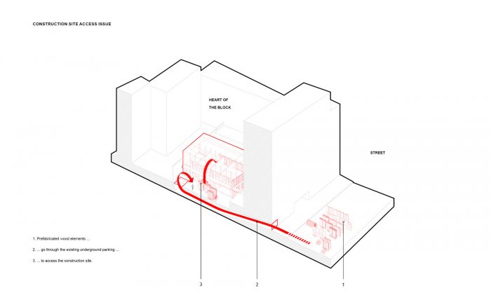 所有这些限制导致我们通过连接街道和街区中心的停车场,通过尺寸极小的地下室(3.5米宽x 2.3米自由高度)来进行这一操作。除了通道限制,还有重量限制,因为新建筑必须跨越现有的停车场,而不妨碍居民使用它。
