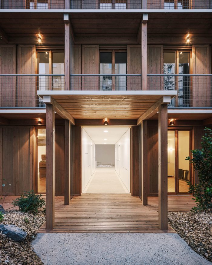 It results from the repetition of decisions taken at the scale of the window, decisions motivated by structural constraints and by the search for durability with the protection of wood against bad weather thanks to the projecting balconies and the white protective paint that protects the ends of the wooden beams and which creates a rhythm on the facade, giving it its own identity.