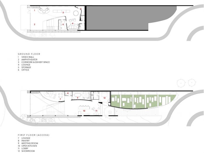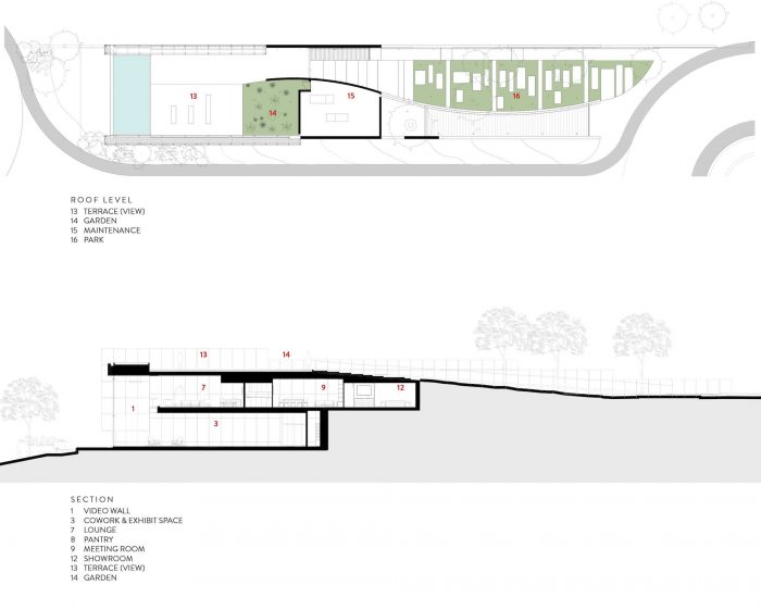 由此产生的方案和形式解决方案与场地多丘陵的特性和从场地到林荫大道对面的公园的视野创建了亲密的联系。建筑物的进入设置在山顶,建筑物在这里与地形相遇,形成一个公园,缓缓上升并引导游客到达一个观景露台,在那里城市和公园的景色被框住。然后,人们沿着混凝土雕塑墙之间下来,找到一个热情的大堂和室内空间。建筑物的内部剖面与山的概念保持一致,引入了一个露天剧场和双层高空间,提供了不断变化和动态流动。露天剧场将用于举办讲座、演示和娱乐活动,而支持空间包括共享办公和展览空间、休息室、餐饮厨房和办公室。