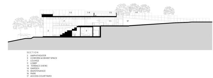 The resulting program and formal solution create an intimate link with the site’s hilly nature and the views from it to the park across the boulevard. Access to the building is set to happen at the top of the hill where the building meets the terrain as a park, gently slopping up and guiding visitors to a viewing terrace where the city and park views are framed. People then come down between concrete sculptural walls to find a welcoming lobby and interior spaces. The interior cross-section of the building keeps with the notion of a hill, introducing an amphitheater and double-height space that provides an ever-changing and dynamic flow. The amphitheater will serve to host lectures, presentations, and entertainment while support spaces include coworking and exhibit spaces, lounges, a catering kitchen, and offices.