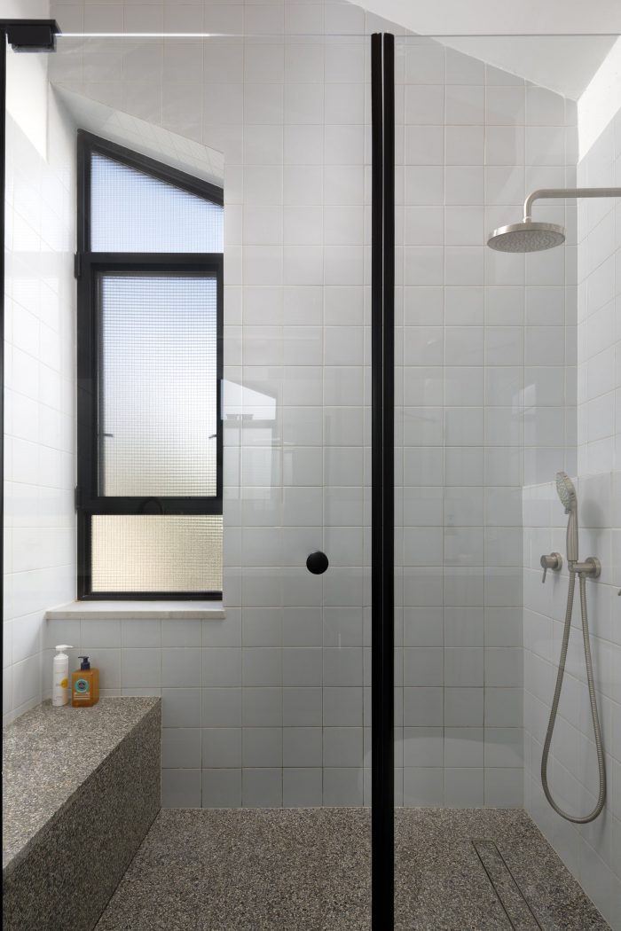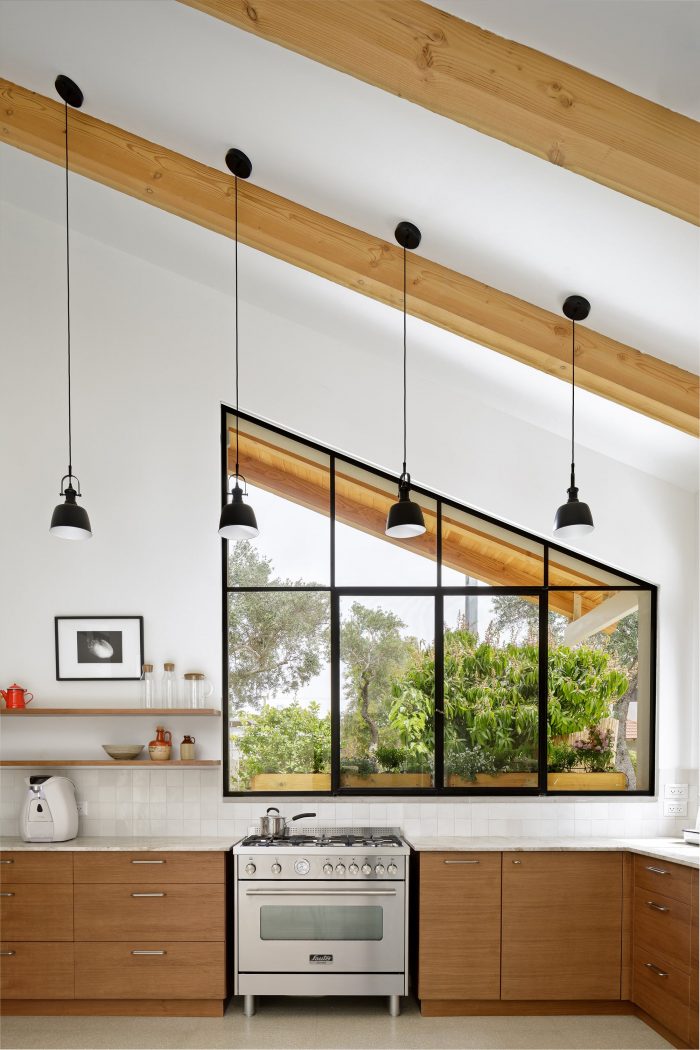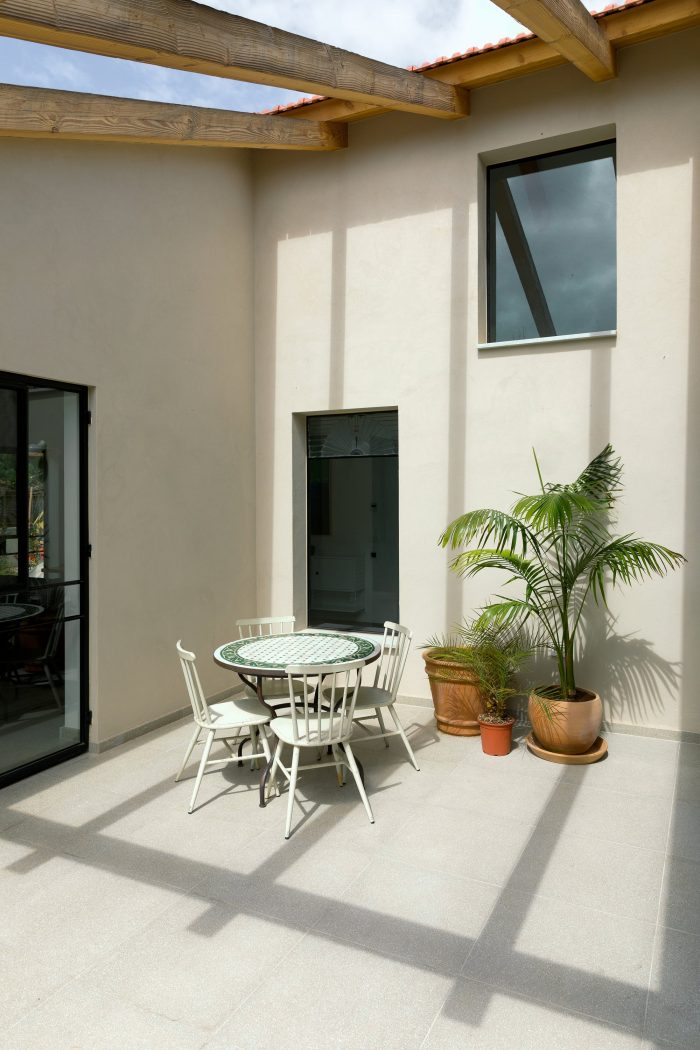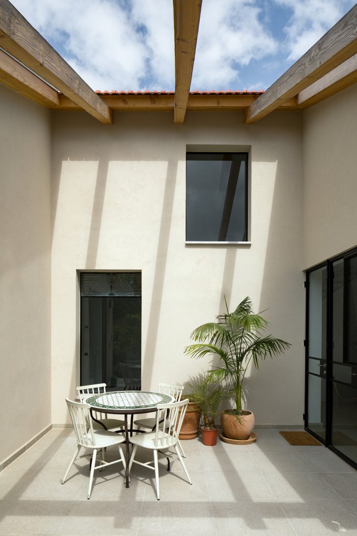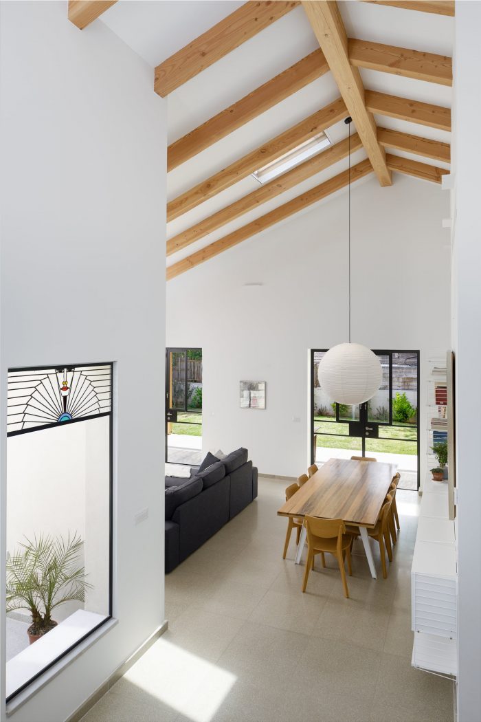The local Mediterranean climate also plays a big part in the design of the house. The slant extends over the entrance, sheltering it from sun and rain. It provides much-needed shade during the morning when the sun hits the large triangular window in the kitchen. The U shape of the house is a classic Mediterranean layout, in which the patio brings natural light into the inner parts of the house. During summer it provides natural ventilation to surrounding spaces and during winter it functions as a sheltered outdoor space. Two skylight windows were placed at the highest peaks of the pitched roof: one right above the dining table, and the other at the top of the stairs. When they are open, they allow warm air to escape, thus naturally cooling the house.
