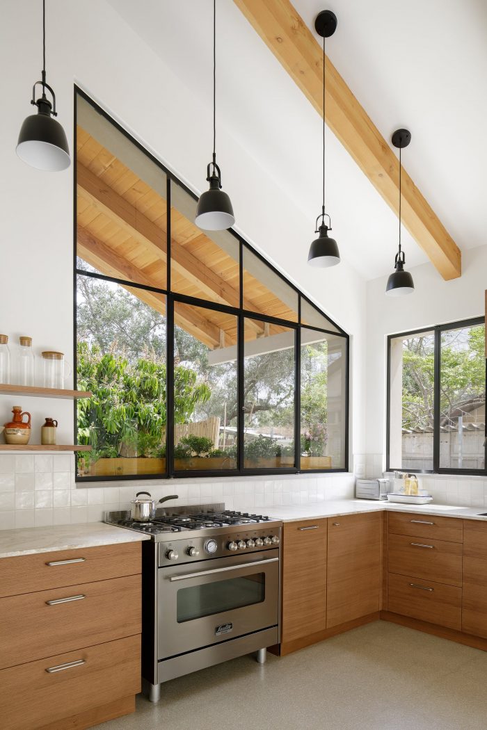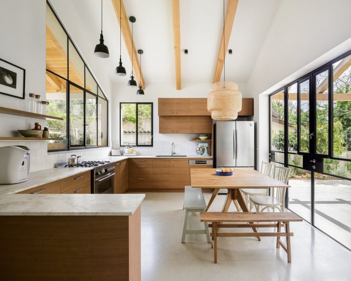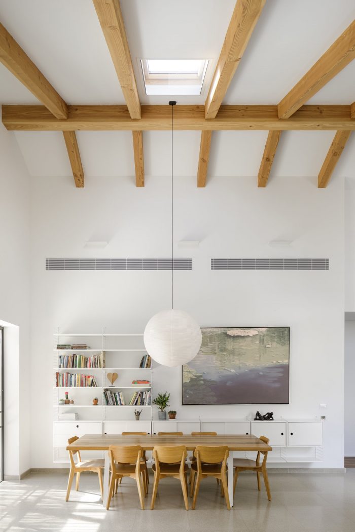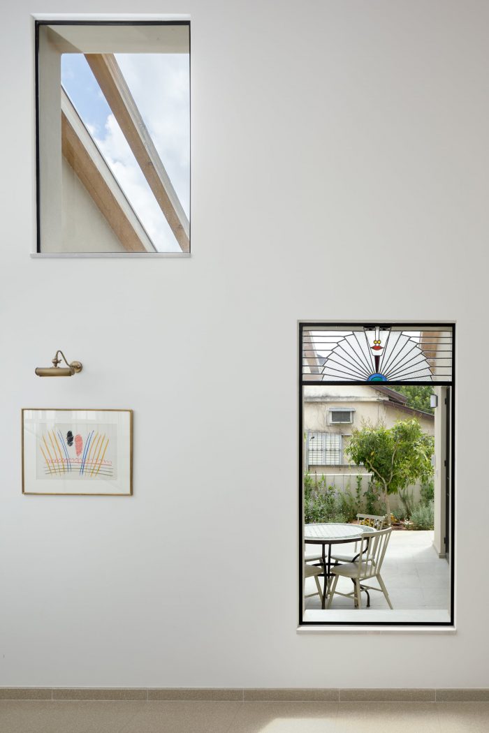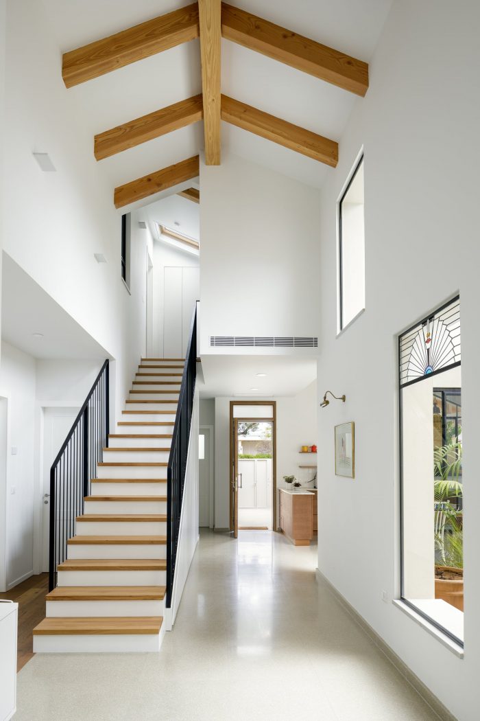 The local Mediterranean climate also plays a big part in the design of the house. The slant extends over the entrance, sheltering it from sun and rain. It provides much-needed shade during the morning when the sun hits the large triangular window in the kitchen. The U shape of the house is a classic Mediterranean layout, in which the patio brings natural light into the inner parts of the house. During summer it provides natural ventilation to surrounding spaces and during winter it functions as a sheltered outdoor space. Two skylight windows were placed at the highest peaks of the pitched roof: one right above the dining table, and the other at the top of the stairs. When they are open, they allow warm air to escape, thus naturally cooling the house.