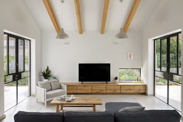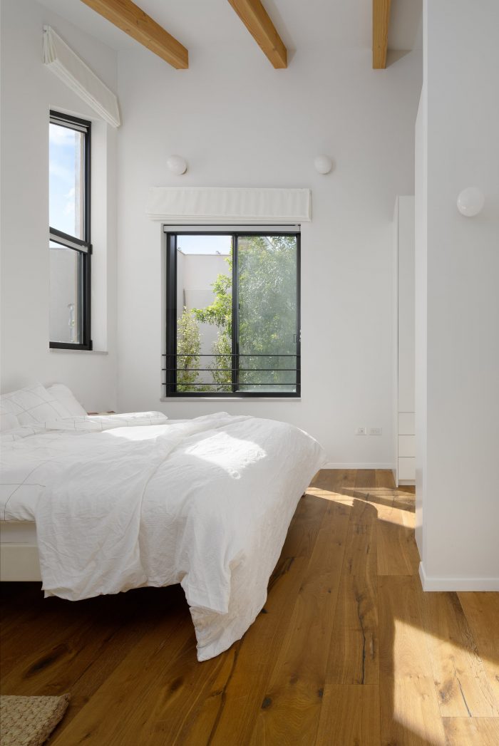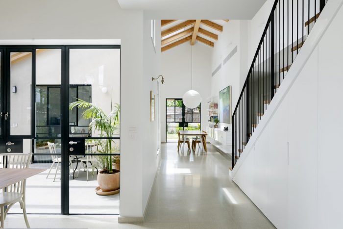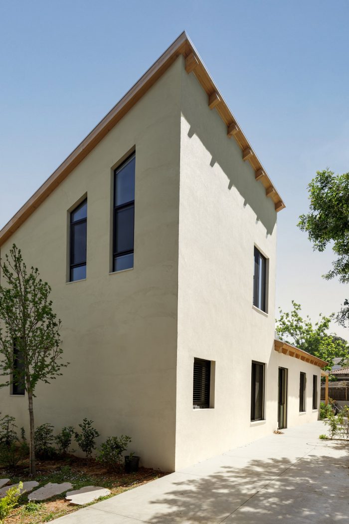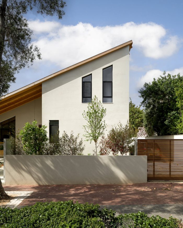 The Patio House, located in a quiet residential neighborhood in Tel Aviv, is a modern interpretation of a classic Mediterranean house. It has a sun-filled patio at its heart, enclosed by all the public areas of the house. The prominent pitched roof extends from the patio upwards to create spacious double-height interior spaces. Designed for a family of five, the house is relatively small, just shy of 180 sqm. The ground floor is planned to take up less than a third of the lot in order to maximize the yards surrounding the house and to create an intimate yet spacious home.