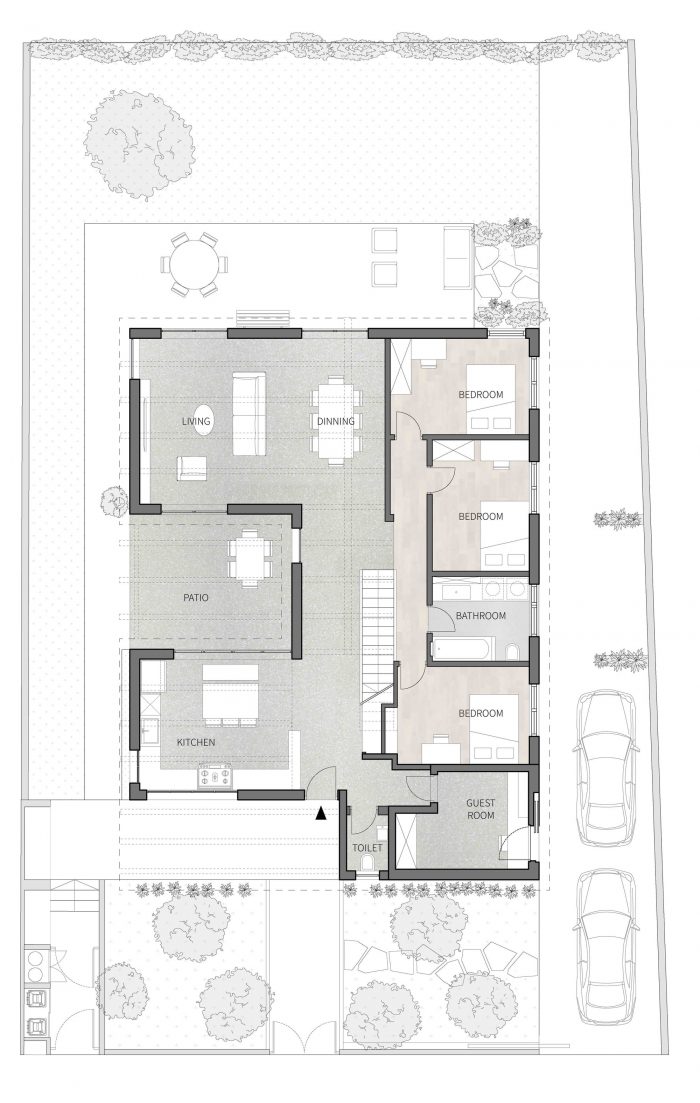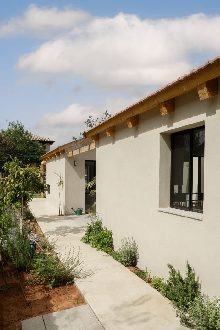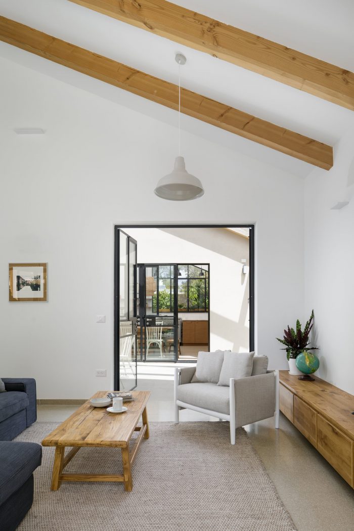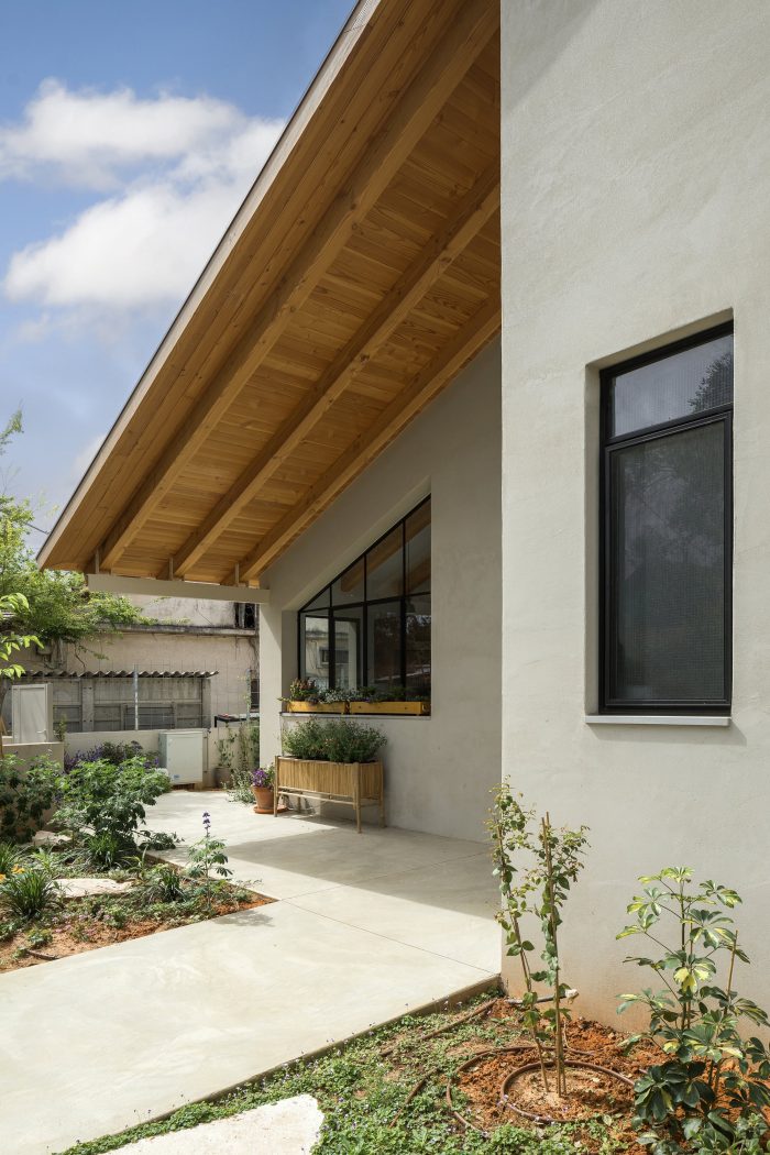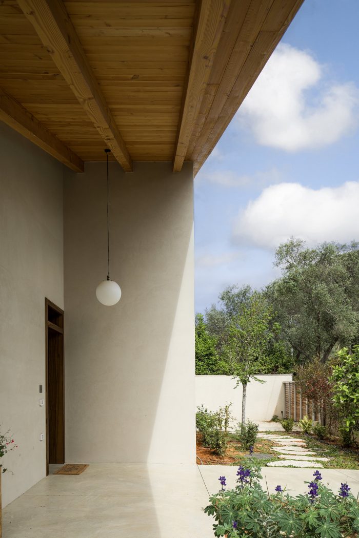 A straight axis connects the entrance gate, the front door, and the glass door leading to the backyard. When standing at the entrance one can experience the entire length of the lot, through the house and straight to the green backyard. All the public areas of the house; kitchen, patio, and living room are located on one side of this axis. They are covered with the same light-khaki-colored terrazzo tiles. Together they create a trio of public spaces where most of everyday life takes place, inside and outside. The intimate patio is connected to the kitchen, living room, and main passageway by large glass openings. It can be seen from almost any spot in the house. The wooden beams of the roof extend outwards over the patio to define the outdoor space from above.