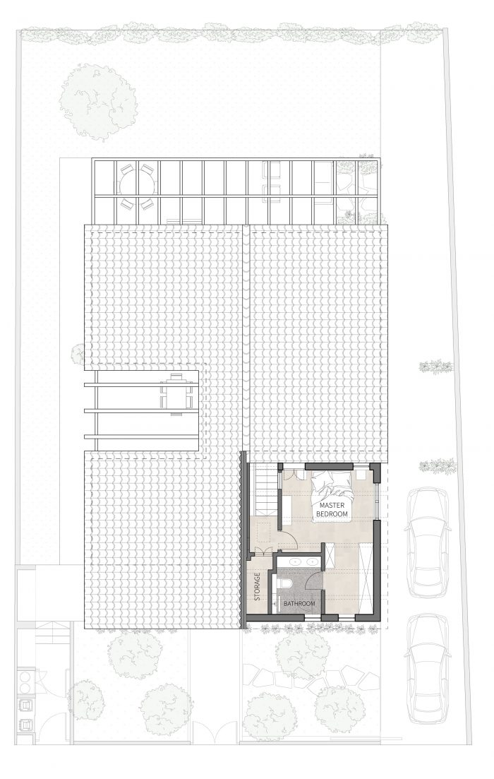 一条笔直的轴线连接着入口大门、前门和通往后院的玻璃门。当站在入口处时,人们可以体验到整个地段的长度,穿过房子,直达绿色后院。房子的所有公共区域;厨房、天井和客厅都位于这条轴线的一侧。它们都覆盖着同样的浅卡其色水磨石瓷砖。它们共同创造了一个三合一的公共空间,大部分的日常生活都是在这里进行的,无论是室内还是室外。亲密的天井与厨房、起居室和主要通道通过大型玻璃开口相连。它几乎可以从房子的任何地方看到。屋顶的木梁在天井上方向外延伸,从上面界定了户外空间。