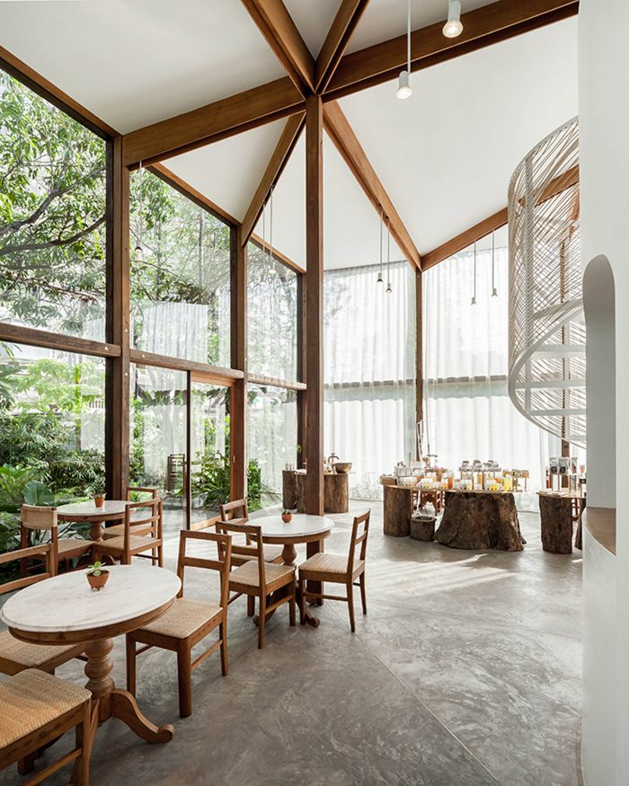 Tucked away in Thonglor’s prime residential neighbourhood, the newly constructed building serves as a shop/showroom for Patom body care products, a small 25-seat café and a place for raising ecological awareness and sustainable living through a series of workshops and farmers market held in the garden, selling fresh produce from the local network of organic farmers.