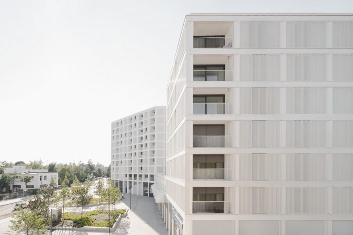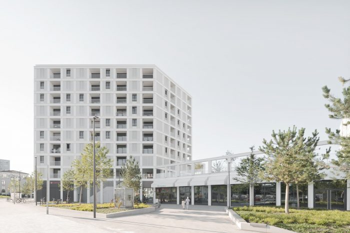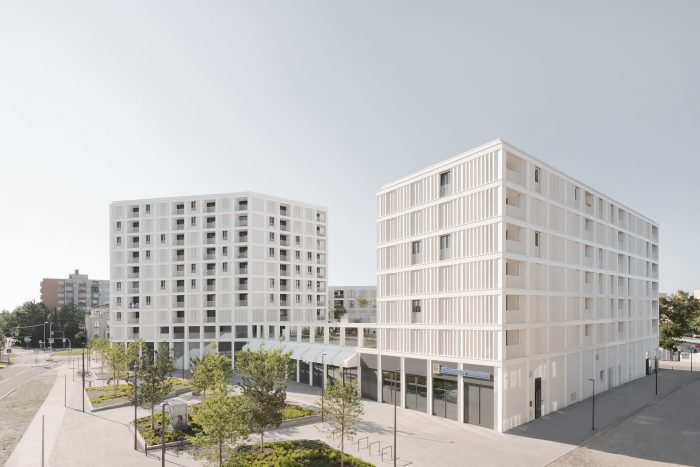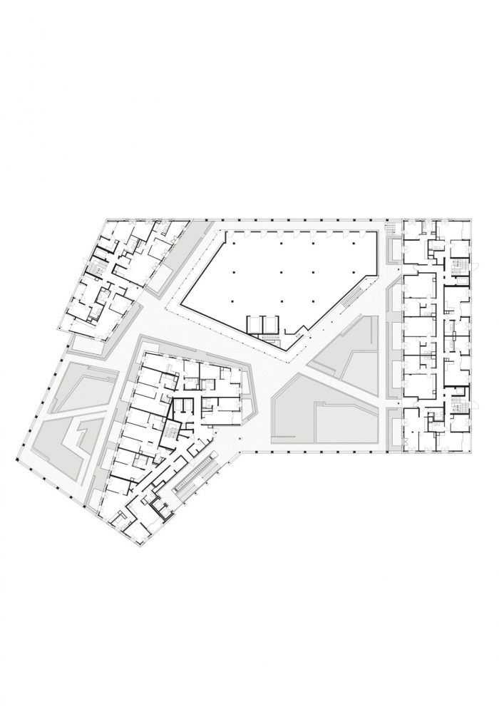With bright white exteriors throughout, this residential and commercial building has an ethereal, elegant appearance, while the layout is distinctive and differentiated. Three polygonal structures are resting on a ground-floor pedestal that covers the entire footprint. Seen from Paul Gerhardt Allee, the tallest of the three structures acts as an eye-catching and welcoming gateway to the new neighborhood. The other two are offset from one another and staggered in height.