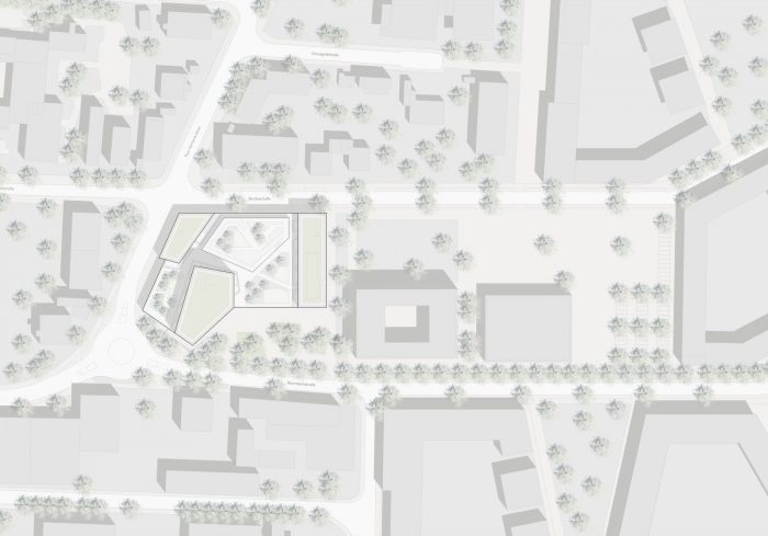 There is a new urban quarter emerging on Paul Gerhardt Allee with apartments, stores, and office space. As the quarter’s principal shopping area complete with the main square out front, this residential and commercial property enjoys a unique urban setting. The primary ambitions of the new build are to highlight the way into the quarter at its western edge, to act as a stabilizing element for the surrounding buildings, and to reflect the different features of this multi-purpose urban landmark straightforwardly and intuitively.
