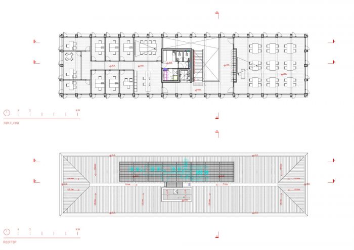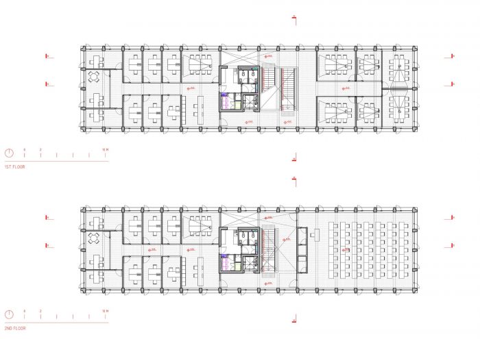 The interior features a central core that is built in a discontinuous circulation creating a circulation system that allows the user to have a perception of the entire space when is moving into the building. Because of the shape of the core the different programs located inside, Offices Space, Seminar Rooms, and Study, areas for the students, are visually and spatially connected.