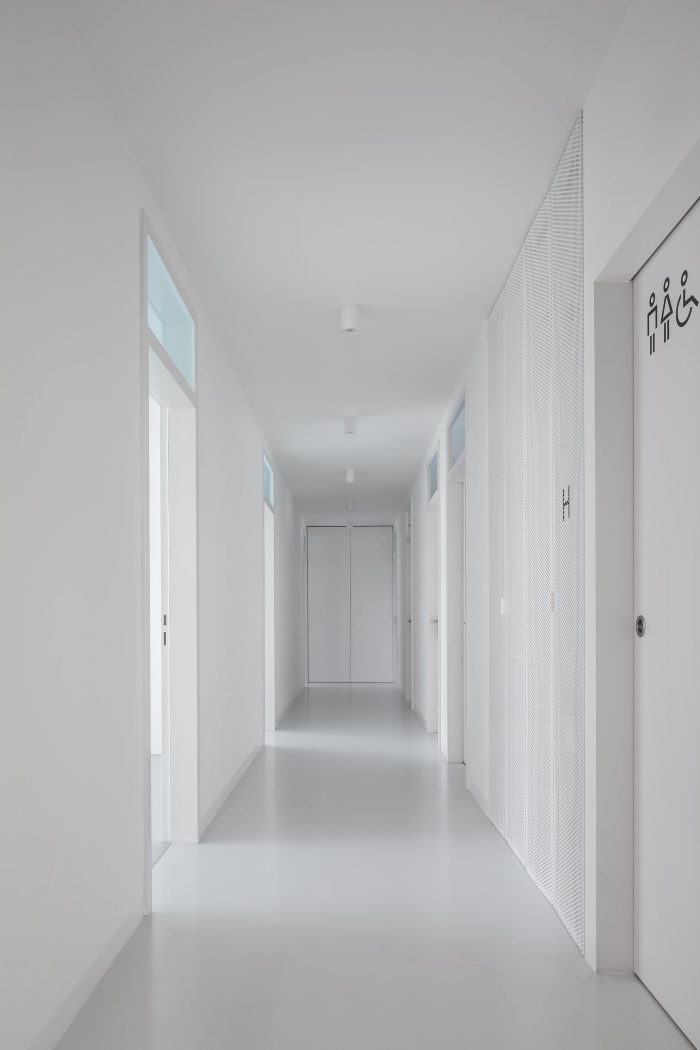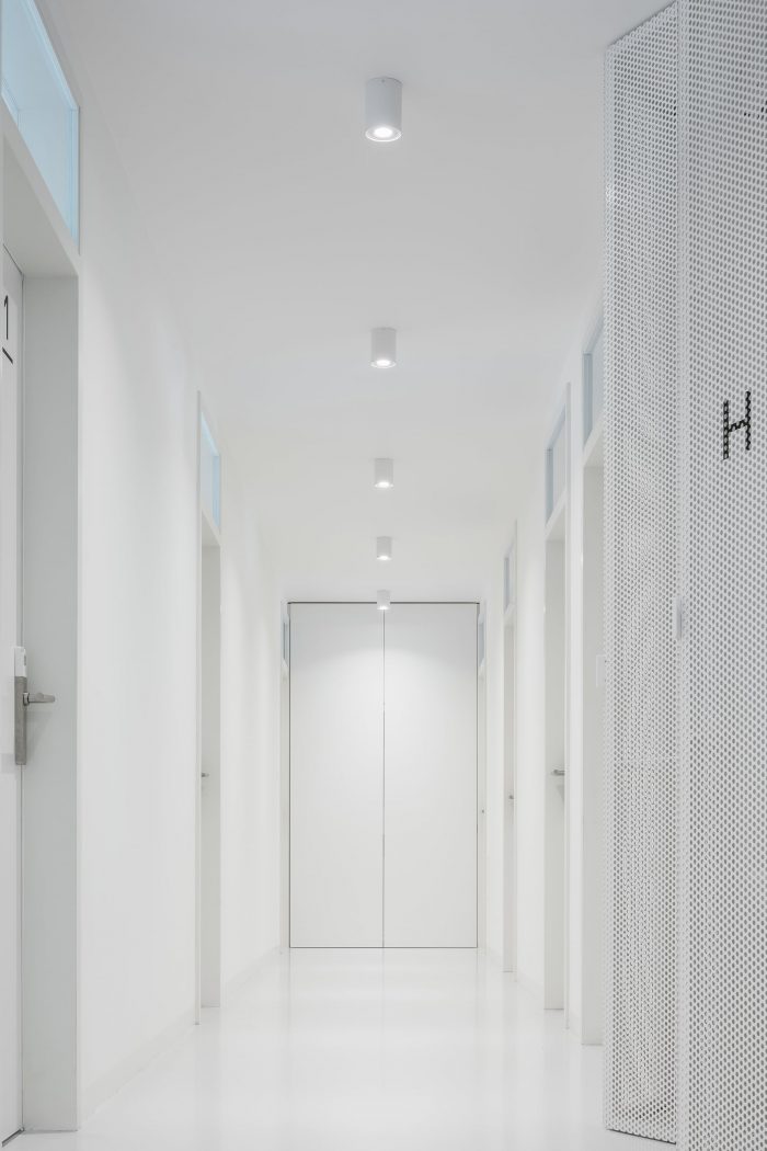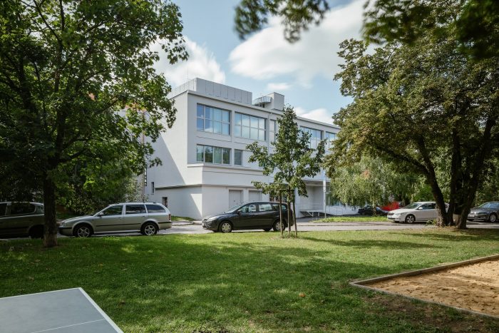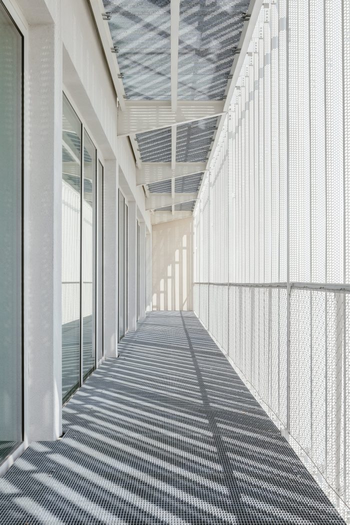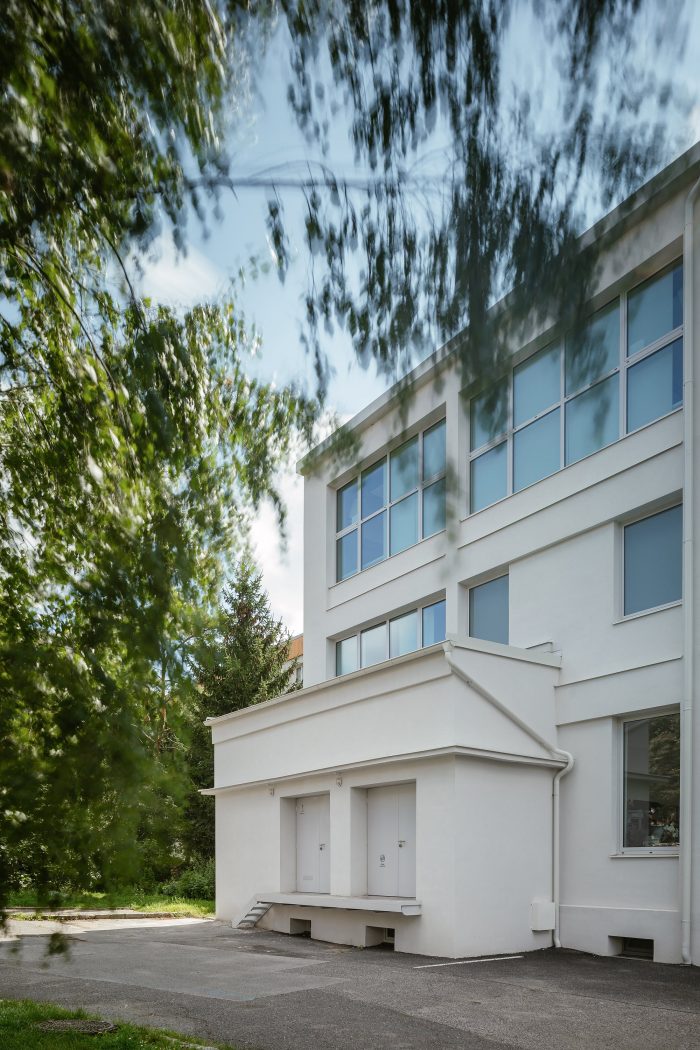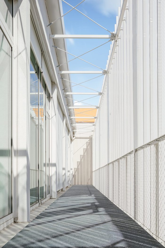 The building is a three-story structure with a reinforced concrete skeleton system. The new third-floor addition lies beneath a roof of pre tensioned panels with a peripheral reinforced concrete loadbearing structure. The building has a partial basement. The extra weight of the new second floor required jet grouting of the foundation columns. The interior layout of the building was redesigned in order to meet contemporary functional needs. On the first and second floors of the building’s south face, walkable steel balcony cantilevers were installed with an outer floating structure of perforated metal slats.
