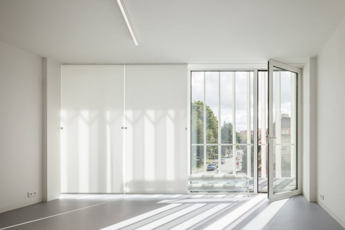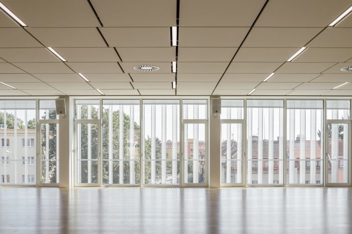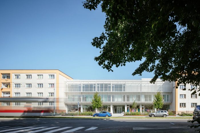 The south-facing building is situated on a busy city boulevard with a tram service. At once distinctive, the façade with balcony platforms shaded by a floating structure of atypically bent perforated slats fulfills a purely functional purpose as well. The design reflects the need to cast a degree of shade on the exposed front of the building and reduce street noise as well as expand the upper floors with useable outdoor space. The concept resulted in an intimate interspace, with the balconies extending along the entire face of the building open to the users of the offices and the dance studio.
