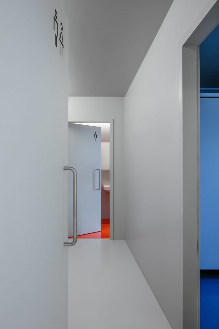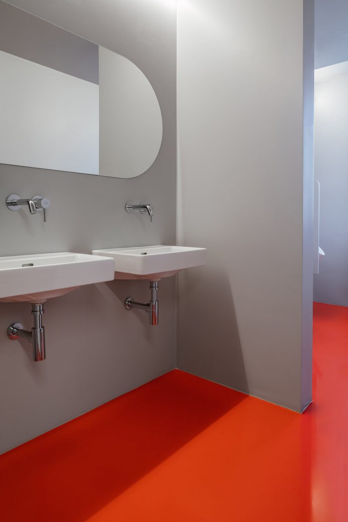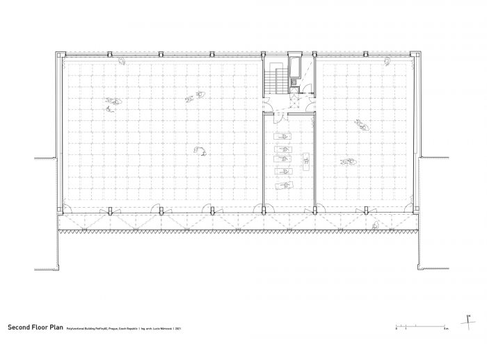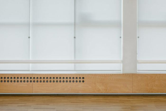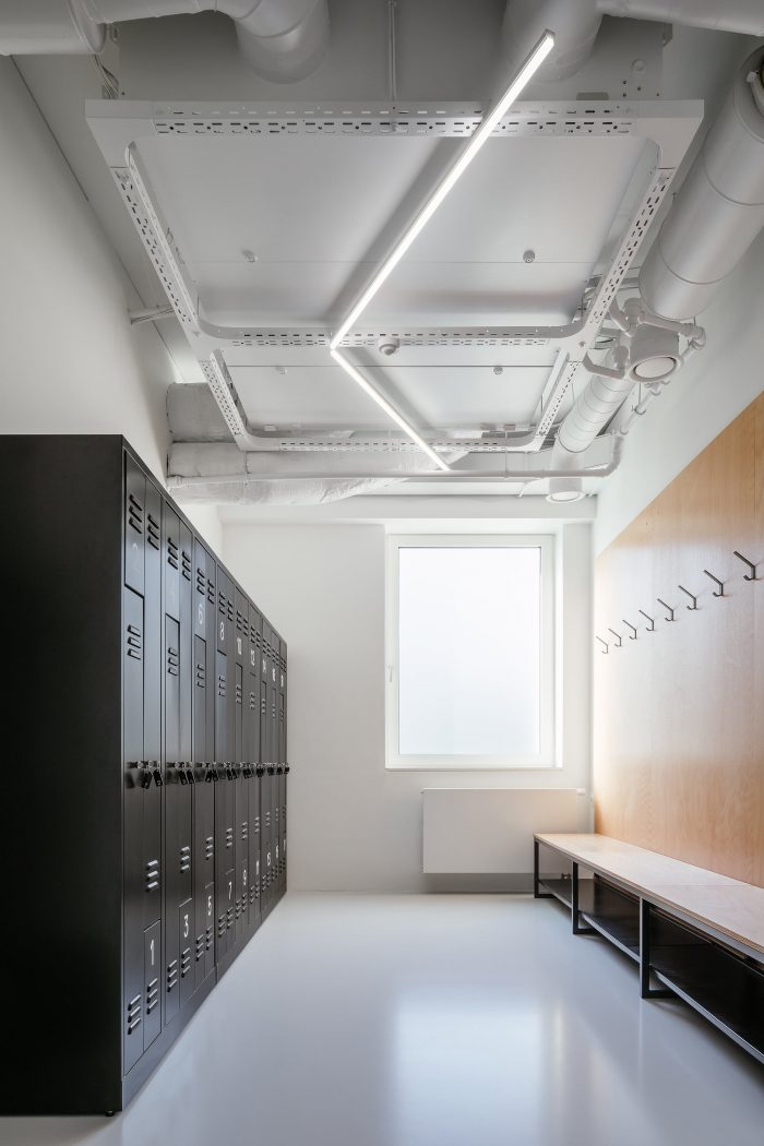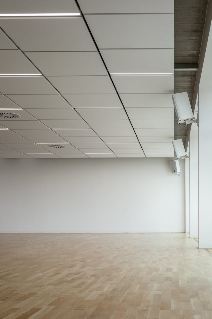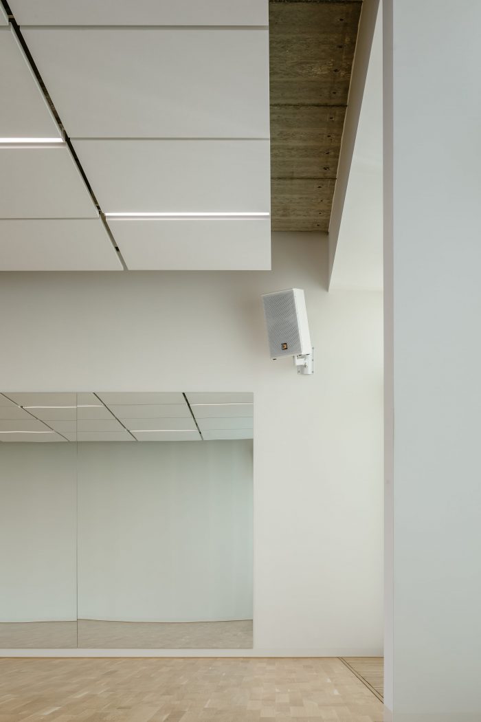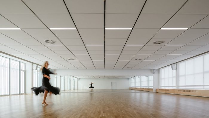 The building was completely renovated. A second floor was constructed atop the existing aboveground levels, and a broad span roof void of internal loadbearing members allowed for the creation of expansive halls fulfilling the requirements for professional dancesport. Such spaces would not have been possible in the lower levels due to the building’s internal loadbearing skeleton system. The dance studio also has facilities on the first floor, including the reception, changing rooms, and a smaller ballet hall. The remainder of this floor comprises office rental space.