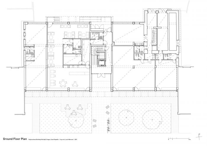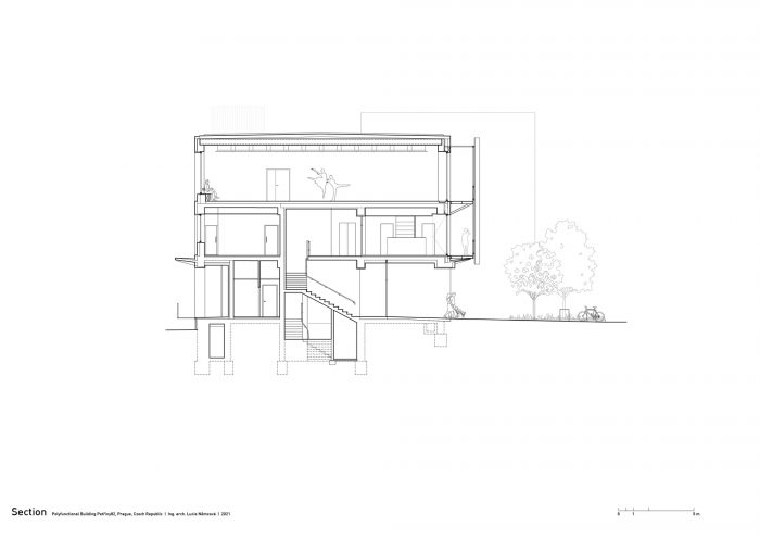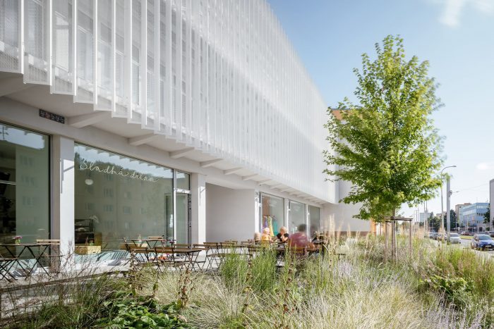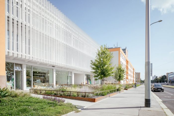 Because one of the key aims of the project was to support the retail parterre function of the building, the original shops on the ground floor were completely renovated and enhanced with suitable utility spaces. This provided an opportunity for small businesses, namely a café, which had been noticeably missing in the locality, to make use of the generous spaces with large-format shop windows looking out on the revised space along the main boulevard. Granted a lease on this frontal space by the city, the owner of the building has committed to its upkeep and financed its renovation by landscape architects. At street level, the building features a pedestrian passage, which in light of its position between two linear apartment buildings significantly increases the accessibility and utility of the surrounding public space.