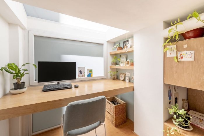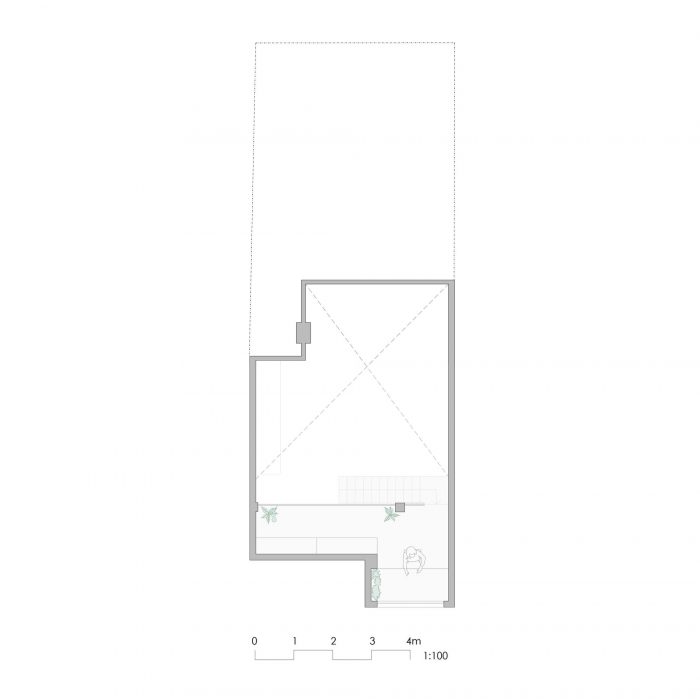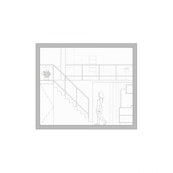 该项目围绕中央空间的两边组织。一个带有木质包层的夹层优化了该区域,将工作室提升到最高层。面向双高空间的阳台创造了一个动态的相互作用,并使空间的不同用途成为可能。在下层,房屋的入口位于一个走廊,有一个指定的空间用于放置鞋子和户外装备。楼梯下的一个隐藏的门通向位于走廊后面的浴室。