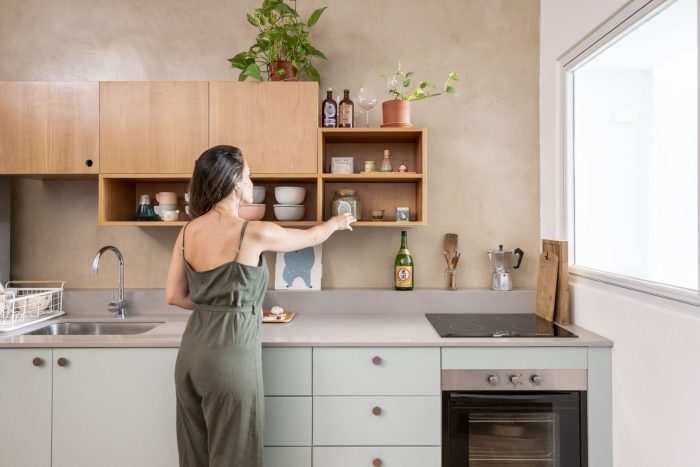 在对面,靠着抛光的水泥大墙的位置是厨房。厨房被设计成一个带有木质元素的综合空间,与周围的体量完美地融合在一起,形成一个有凝聚力的、战略性的布局。