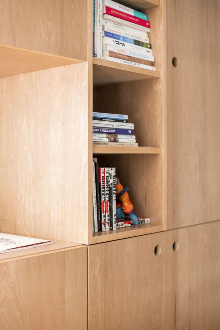 On the opposite side and positioned against the large wall of polished cement is the kitchen. Designed as an integrated space with wooden elements, the kitchen blends seamlessly with the surrounding volumes to form a cohesive and strategically placed layout.