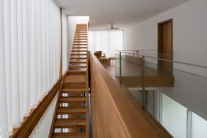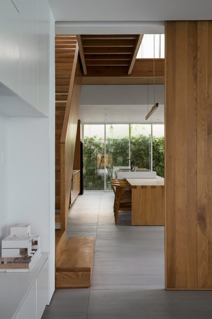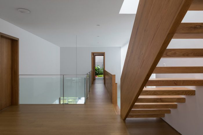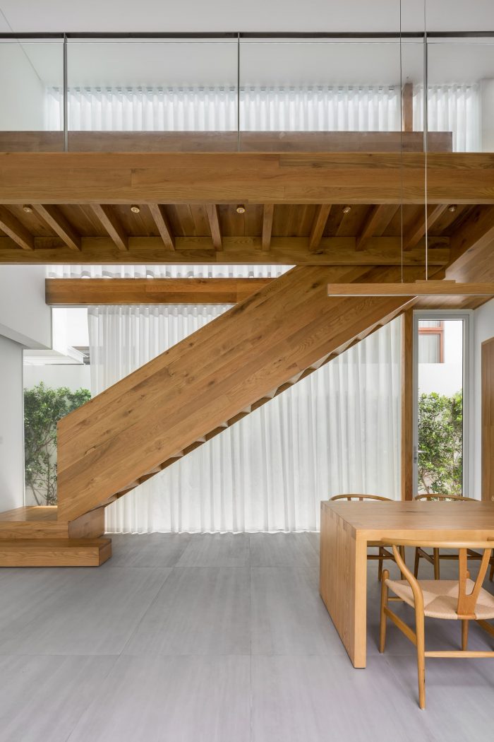 A living room with a column-release structure and a large-aperture sliding glass wall system can expand the view. The dining room with atrium space and connecting wooden corridor above enhances interaction. Bright space, modern materials, and minimalist wooden furniture have created a relaxed atmosphere for the house.