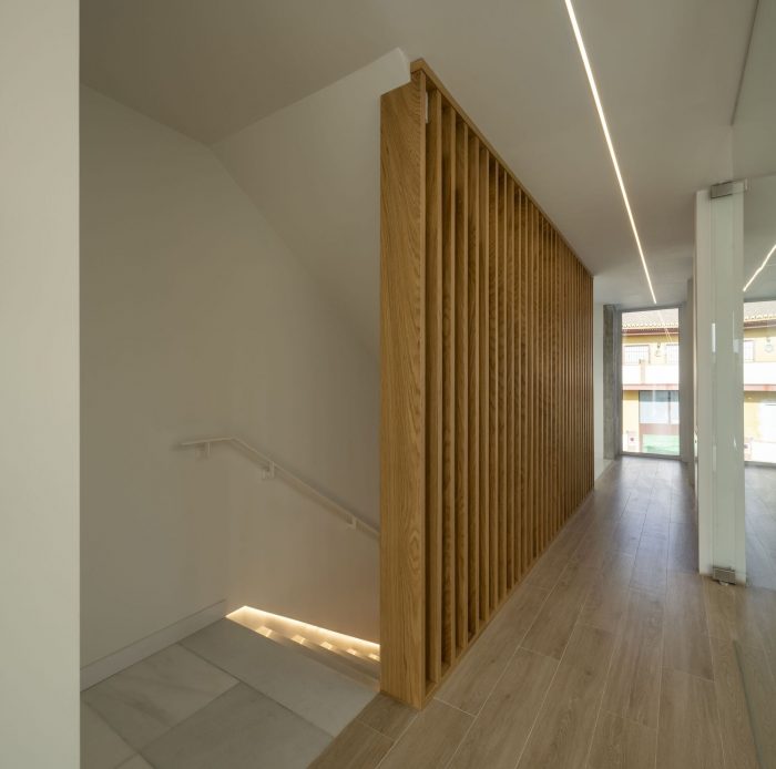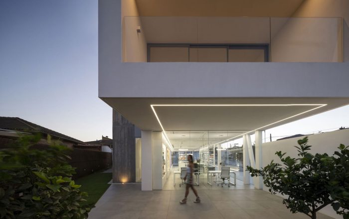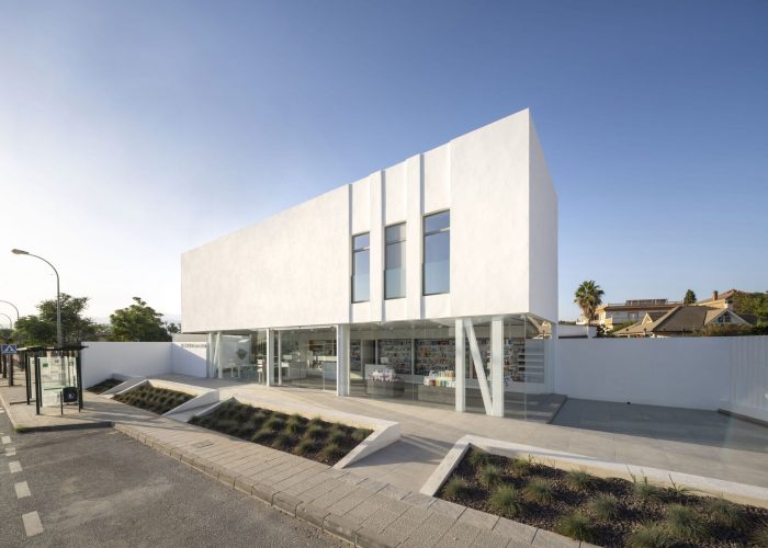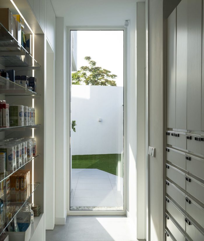 Indoor the pharmacy, prominence is transferred to the pharmaceutical product by the presence of the white color and the continuity of the space. It gives both outstanding qualities to dwellers and pharmacy customers. Everyone is surrounded by a play of light, color, and diaphanous spaces which accommodate users. It is about to create a calm and introverted atmosphere, which permits the house to be a place of rest and tranquility; and the pharmacy a functional and versatile space, ready to be used. A generous space not so much too the large or small size of space as to the approach.