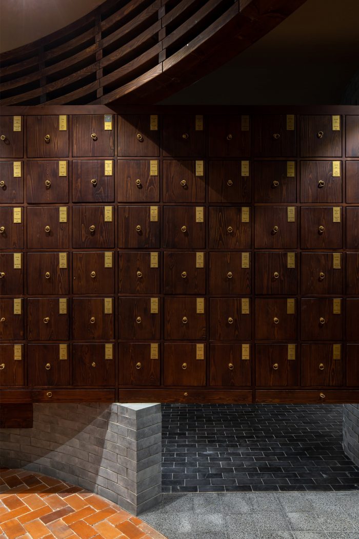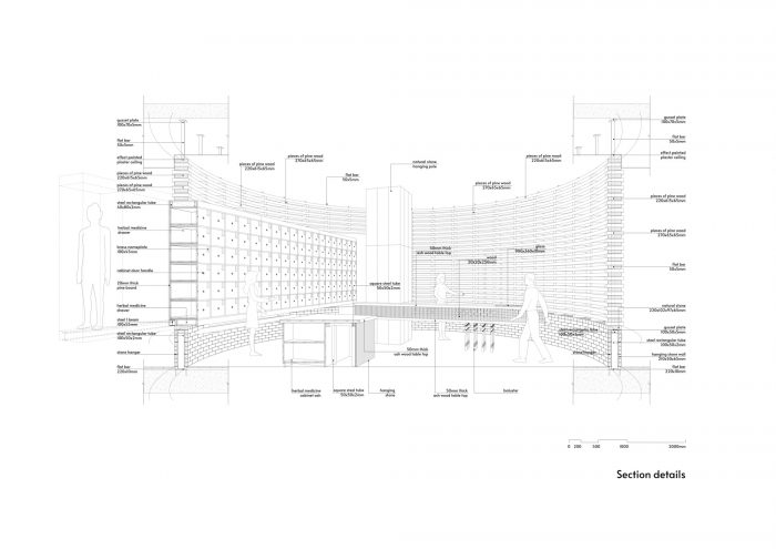 接待区--底层--接待区位于大楼的主厅,紧邻住宅区最繁忙的交通路线之一。设计以利用自然和传统材料为导向,如陶瓷瓦片、天然岩石和木材......,结合起来,带来一种欢迎的感觉和温暖的感觉。一个浸泡在传统中的空间与当代的现代环境交织在一起,有助于弥补工业环境的不足,并创造出一种诱人的氛围,呼吁人们去体验和发现。这个空间的焦点是由木材和岩石混合制成的弧形墙,采用传统的手工方法建造。优雅的曲线不仅决定了每个功能,而且还突出了传统药剂师的形象,他们在装有110多种不同草药的柜子墙前仔细而精确地调制每一剂药,唤起了空间中传统医药的独特感。在它的旁边是专家在柜台前的说明,帮助病人更好地理解,对传统医学的方法更加放心和信任。