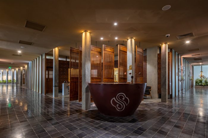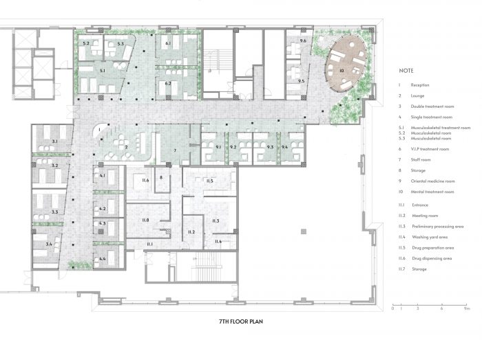 The Clinical Space - 7th Floor - According to the belief of those who practice this discipline, to effectively cure an ailment, a patient must be treated both physically and mentally. Because of that, the specialized clinical space's design seeks inspiration from the tranquillity of traditional Vietnamese architecture. The special rhythm of this space is formed by 31 rock columns, spanning the main hallway. Besides that, each specialized clinic is separated by greenery, creating in them the necessary privacy and freshness, further adding to the special rhythm. Each of the hallway's ends opens up to natural elements, granting patients access to more greenery and natural light... bringing about comfort, and relaxation and helping them to reconnect with nature before their treatments commence. Different from the reception area, the clinical space is made with a combination of natural and man-made materials. Glass is used to maximize the project's ability to receive natural light. This, combined with the vertical architectural elements, gives the space a sense of height and airiness.