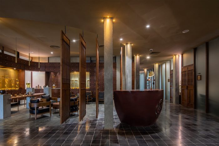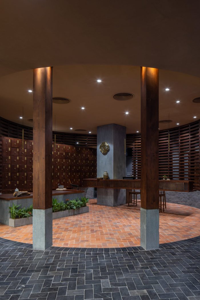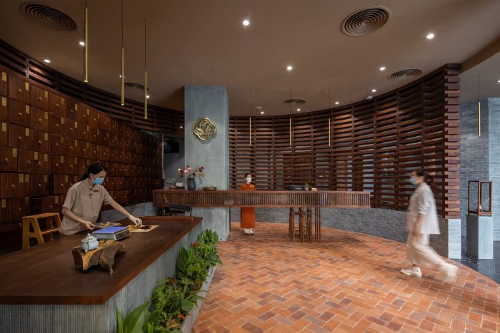 The Reception Area - Ground Floor - The reception area is located in the main hall of the building, adjacent to one of the busiest traffic routes in the residential area. The design is oriented around the utilization of natural and traditional materials, such as ceramic tilings, natural rock, and wood..., combined to bring about a welcoming feeling and a sense of warmth. A space soaked in tradition intertwines with the contemporary, modern environment, helps to remedy the industrial setting, and creates an inviting atmosphere, calling on people to experience and discover. The focal point of this space is the curved wall made of a mixture of wood and rock, built using traditional, artisanal methods. The elegant curve not only decides each function but also highlights the image of the traditional pharmacist, carefully and precisely concocting each dose of medicine in front of the wall of cabinets, containing over 110 different herbs, invoking the sense of uniqueness of traditional medicine in the space. By its side are the instructions given by specialists at the counter, helping patients to better understand, to be more reassured and trusting in the methods of traditional medicine.
