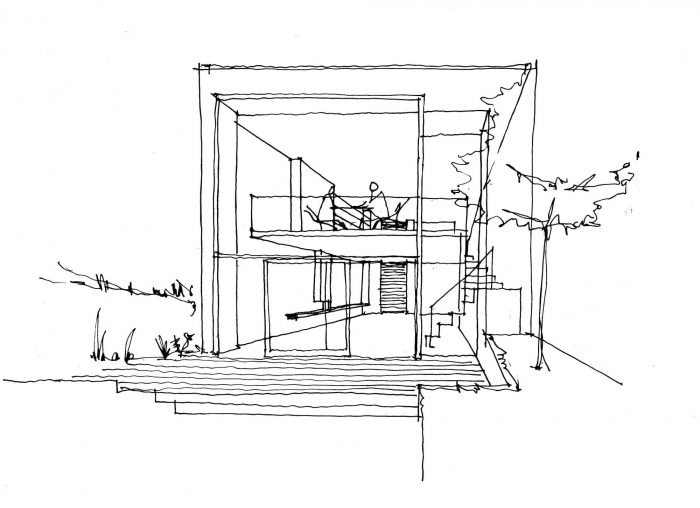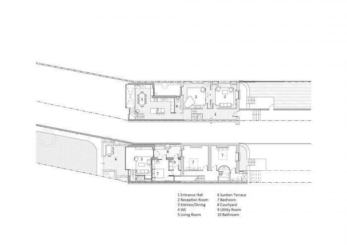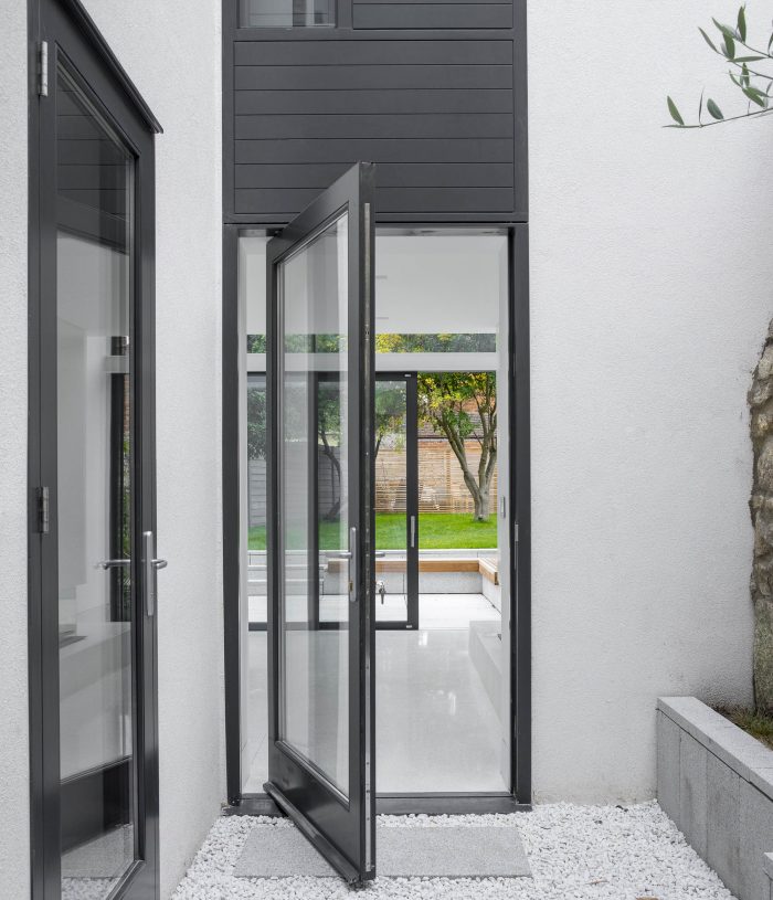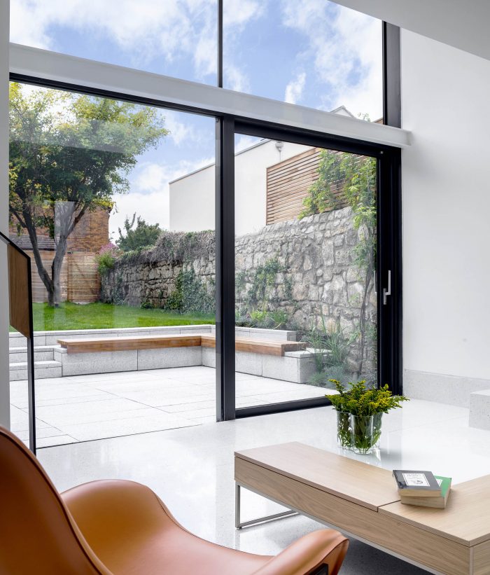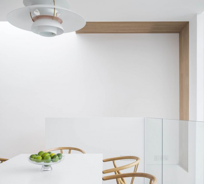 The extension contains a new WC and kitchen at upper ground level and a new bedroom , utility and living room at lower ground level. The new bedroom and utility open into a new internal courtyard. The kitchen is connected to the family room below by a double height void and the floor to ceiling glass connects the kitchen and living room to the garden.