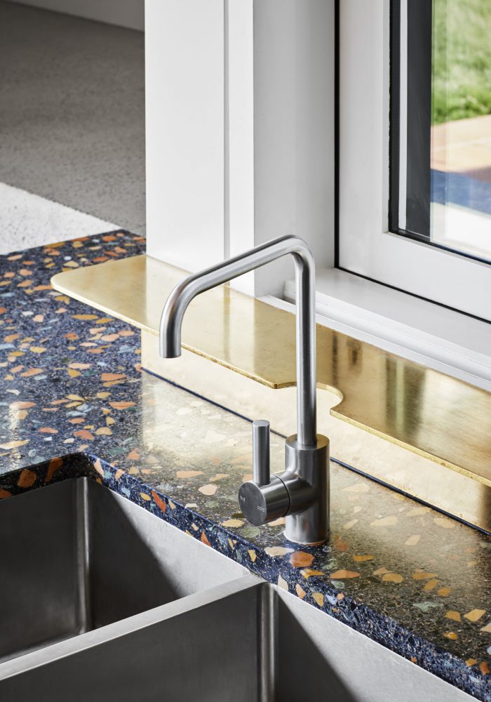 Having repositioned the front door at the side of the house, the entry floor level was set at kitchen bench top height, allowing a flow of space from the entry through to the kitchen and out to the BBQ zone. Half a flight up is the original doorway to the old part of the house. Another half stair up there’s a timber batten landing which provides a connection between the ground and first floor.
